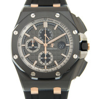 Black ceramic case with a black rubber strap. 8 screws fixed black ceramic bezel. Grey dial with gold-tone hands and index hour markers. Tachymeter scale around the outer rim. Dial Type: Analog. Luminescent hands and markers. Date display at the 3 o'clock position. Chronograph - three sub-dials displaying: 60 second, 30 minute and 12 hours. Audemars Piguet Calibre 3126/3840 Automatic movement, based upon Audemars Piguet 3120, containing 59 Jewels, composed of 365 parts, bitting at 21600 vph, and has a power reserve of approximately 50 hours. Scratch resistant sapphire crystal. Screw down crown. Skeleton transparent exhibition see through case back. Octagon case shape, case size: 44 mm, case thickness: 14.4 mm. Pin buckle clasp. Water resistant at 100 meters / 330 feet. Functions: chronograph, date, hour, minute, second. Additional Info: limited edition of 300. Luxury watch style. Watch label: Swiss Made. Audemars Piguet Royal Oak Offshore "Pride of Germany" Grey Dial Men's Watch 26415 CASE Case Size: 44 Case Thickness: 14.4 mm Case Material: Ceramic Case Shape: Octagon Case Back: Skeleton Transparent Exhibition See Through BAND Band Material: Rubber Band Type: Strap Band Color: Black Clasp: Pin Buckle DIAL Dial Color: Grey Type: Analog Crystal: Scratch Resistant Sapphire Hands: Gold-tone Dial Markers: Index Second Markers: Tachymeter Scale around the outer rim Sub Dials: Three - 60 Second, 30 Minute and 12 Hour Luminiscence: Hands and Markers Bezel: 8 Screws Fixed Bezel Color: Black Bezel Material: Ceramic Crown: Screw Down INFORMATION Brand: Audemars Piguet Series: Royal Oak Offshore Collection Name: Royal Oak Offshore Gender: Mens Model: 26415CE.OO.A002CA.01 Watch Label: Swiss Made Movement: Automatic Engine: Audemars Piguet Calibre 3126/3840 Power Reserve: 50 hours FEATURES Water Resistance: 100 meters / 330 feet Calendar: Date display at the 3 o'clock position Functions: Chronograph, Date, Hour, Minute, Second Watch Features: Chronograph, Rubber, Gold, Ceramic, Analog ADDITIONAL INFO Watch Style: Luxury Warranty: 2 Year Jomashop Warranty Additional Info: Limited Edition of 300 Jomashop Sku: AP26415CEOOA002CA01 Department: Watches Category: Watches