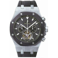 Silver-tone stainless steel case with a black rubber strap. 8 screws fixed black rubber clad steel bezel. Black dial with luminous hands and index hour markers. Minute markers around the outer rim. Dial Type: Analog. Three sub-dials displaying: 60 second, 30 minute and tourbillon. Audemars Piguet Calibre 2889 Hand Wind movement, containing 28 Jewels, composed of 290 parts, bitting at 21600 vph, and has a power reserve of approximately 72 hours. Scratch resistant sapphire crystal. Pull / push crown. Skeleton transparent case back. Octagon case shape, case size: 44 mm, case thickness: 13.15 mm. Deployment clasp. Water resistant at 20 meters / 65 feet. Functions: tourbillon, chronograph, column wheel, hour, minute, small second. Royal Oak Offshore Chronograph Tourbillon Series. Luxury watch style. Watch label: Swiss Made. Item Variations: 26377SK OO D002CA01, 26377SK-OO-D002CA01, 26377SK/OO/D002CA01, 26377SKOOD002CA01. Audemars Piguet Royal Oak Offshore Chronograph Tourbillon Men's Watch 26377SKOOD002CA01. GENERAL Color: Black CASE Case Size: 44 Case Thickness: 13.15 mm Case Material: Stainless Steel Case Shape: Octagon Case Back: Skeleton Transparent BAND Band Material: Rubber Band Type: Strap Band Color: Black Clasp: Deployment DIAL Dial Color: Black Type: Analog Crystal: Scratch Resistant Sapphire Hands: Luminous Dial Markers: Index Second Markers: Minute markers around the outer rim Sub Dials: Three - 60 Second, 30 Minute and Tourbillon Bezel: 8 Screws Fixed Bezel Color: Black Bezel Material: Rubber Clad Steel Crown: Pull / Push INFORMATION Brand: Audemars Piguet Series: Royal Oak Offshore Chronograph Tourbillon Collection Name: Royal Oak Offshore Chronograph Tourbillon Gender: Mens Model: 26377SK.OO.D002CA01 Watch Label: Swiss Made Movement: Hand Wind Engine: Audemars Piguet Calibre 2889 Power Reserve: 72 hours FEATURES Water Resistance: 20 meters / 65 feet Functions: Tourbillon, Chronograph, Column Wheel, Hour, Minute, Small Second Watch Features: Tourbillon, Chronograph, Stainless Steel, Rubber, Analog ADDITIONAL INFO Watch Style: Luxury Warranty: 2 Year Jomashop Warranty Jomashop Sku: AP26377SKOOD002CA01 Item Variation: 26377SK OO D002CA01, 26377SK-OO-D002CA01, 26377SK/OO/D002CA01, 26377SKOOD002CA01 Department: Watches Category: Watches
