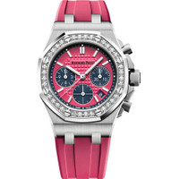 Silver-tone stainless steel case with a pink rubber strap. 8 screws fixed diamond set bezel. Pink dial with silver-tone hands and index hour markers. Minute markers around the outer rim. Dial Type: Analog. Date display between 4 and 5 o'clock position. Chronograph - three sub-dials displaying: 60 second, 30 minute and 12 hours. Audemars Piguet Calibre 2385 Automatic movement, containing 37 Jewels, composed of 304 parts, bitting at 21600 vph, and has a power reserve of approximately 40 hours. Scratch resistant sapphire crystal. Screw down crown. Octagon case shape, case size: 37 mm, case thickness: 12.4 mm. Water resistant at 50 meters / 165 feet. Functions: chronograph, date, hour, minute, second. Additional Info: bezel set with 32 diamonds (1.02 carats). Luxury watch style. Watch label: Swiss Made. Audemars Piguet Royal Oak Offshore Pink Dial Ladies Chronograph Watch 26231ST.ZZ.D069CA.01. INFORMATION Brand: Audemars Piguet Series: Royal Oak Offshore Collection Name: Royal Oak Offshore Gender: Womens Model: 26231ST.ZZ.D069CA.01 Watch Label: Swiss Made Movement: Automatic Engine: Audemars Piguet Calibre 2385 Power Reserve: 40 hours CASE Case Size: 37 mm Case Thickness: 12.4 mm Case Material: Stainless Steel Case Shape: Octagon BAND Band Material: Rubber Band Type: Strap Band Color: Pink DIAL Dial Color: Pink Type: Analog Crystal: Scratch Resistant Sapphire Hands: Silver-tone Dial Markers: Index Second Markers: Minute Markers around the outer rim Sub Dials: Three - 60 Second, 30 Minute and 12 Hour Bezel: 8 Screws Fixed Bezel Material: Diamond Set Crown: Screw Down FEATURES Water Resistance: 50 meters / 165 feet Calendar: Date display between 4 and 5 o'clock position Functions: Chronograph, Date, Hour, Minute, Second Watch Features: Diamond, Chronograph, Stainless Steel, Rubber, Analog ADDITIONAL INFO Watch Style: Luxury Warranty: 2 Year Jomashop Warranty Additional Info: bezel set with 32 diamonds (1.02 carats) Jomashop Sku: AP26231STZZD069CA01 Department: Watches Category: Watches