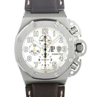 Silver-tone stainless steel case with a black leather strap. 8 screws fixed silver-tone bezel. Silver dial with silver-tone hands and Arabic numeral hour markers. Minute markers around the outer rim. Dial Type: Analog. Luminescent hands and markers. Date display at the 3 o'clock position. Chronograph - three sub-dials displaying: 60 second, 30 minute and 12 hour. Audemars Piguet Calibre 3126/3840 Automatic movement, based upon Audemars Piguet 3120, containing 59 Jewels, composed of 365 parts, bitting at 21600 vph, and has a power reserve of approximately 50 hours. Scratch resistant sapphire crystal. Screw down crown. Solid case back. Octagon case shape. Case size: 47 mm. Tang clasp. Functions: chronograph, date, hour, minute, small second. Luxury watch style. Watch label: Swiss Made. Item Variations: 25863TI 0 A080CU 01, 25863TI-0-A080CU-01, 25863TI/0/A080CU/01, 25863TI0A080CU01. Audemars Piguet Royal Oak Offshore Silver Dial Leather Men's Watch 25863TI.0.A080CU.01. GENERAL Color: Silver CASE Case Size: 47 Case Material: Stainless Steel Case Shape: Octagon Case Back: Solid BAND Band Material: Leather Band Type: Strap Band Color: Black Clasp: Tang DIAL Dial Color: Silver Type: Analog Crystal: Scratch Resistant Sapphire Hands: Silver-tone Dial Markers: Arabic Numeral Second Markers: Minute Markers around the outer rim Sub Dials: Three - 60 Second, 30 Minute and 12 Hour Luminiscence: Hands and Markers Bezel: 8 Screws Fixed Bezel Color: Silver-tone Bezel Material: Stainless Steel Crown: Screw Down INFORMATION Brand: Audemars Piguet Series: Royal Oak Offshore Collection Name: Royal Oak Offshore Gender: Mens Model: 25863TI.0.A080CU.01 Watch Label: Swiss Made Movement: Automatic Engine: Audemars Piguet Calibre 3126/3840 Power Reserve: 50 hours FEATURES Calendar: Date display at the 3 o'clock position Functions: Chronograph, Date, Hour, Minute, Small Second Watch Features: Chronograph, Stainless Steel, Leather, Analog ADDITIONAL INFO Watch Style: Luxury Warranty: 2 Year Jomashop Warranty Jomashop Sku: AP25863TI0A080CU01 Item Variation: 25863TI 0 A080CU 01, 25863TI-0-A080CU-01, 25863TI/0/A080CU/01, 25863TI0A080CU01 Department: Watches Category: Watches