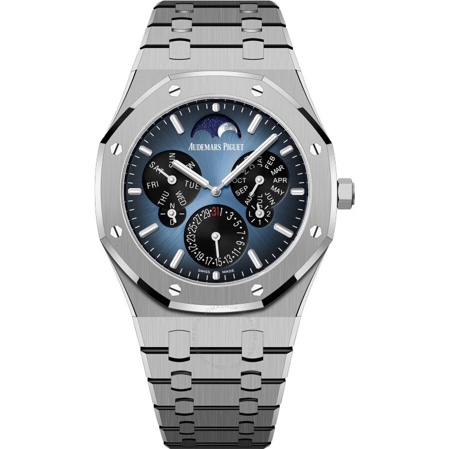 Grey titanium case and bracelet. Fixed grey titanium bezel. Blue dial with silver-tone hands and index hour markers. Minute markers around the outer rim. Dial Type: Analog. Luminescent hands and markers. Date display at the 6 o'clock position. Audemars Piguet Calibre 5133 automatic movement with a 40-hour power reserve. Scratch resistant sapphire crystal. Screw down crown. Transparent see through case back. Round case shape, case size: 41 mm, case thickness: 6.2 mm. Fold over clasp with a safety release. Water resistant at 20 meters / 66 feet. Functions: perpetual calendar with day, date, astronomical moon, month, leap year, night and day indication, hours and minutes. Additional Info: limited edition of 200. Royal Oak Series. Luxury watch style. Watch label: Swiss Made. Audemars Piguet Royal Oak Perpetual Automatic Blue Dial Men's Watch 26586TI.OO.1240TI.01. CASE Case Size: 41 Case Thickness: 6.2 mm Case Material: Titanium Case Shape: Round Case Back: Transparent See Through BAND Band Material: Titanium Band Type: Bracelet Band Color: Grey Clasp: Fold Over with Safety Release DIAL Dial Color: Blue Type: Analog Crystal: Scratch Resistant Sapphire Hands: Silver-tone Dial Markers: Index Second Markers: Minute Markers around the outer rim Luminiscence: Hands and Markers Bezel: Fixed Bezel Color: Grey Bezel Material: Titanium Crown: Screw Down INFORMATION Brand: Audemars Piguet Series: Royal Oak Collection Name: Royal Oak Gender: Mens Model: 26586TI.OO.1240TI.01 Watch Label: Swiss Made Movement: Automatic Engine: Audemars Piguet Calibre 5133 Power Reserve: 40 hours FEATURES Water Resistance: 20 meters / 66 feet Calendar: Date display at the 6 o'clock position Functions: Perpetual Calendar With Day, Date, Astronomical Moon, Month, Leap Year, Night And Day Indication, Hours And Minutes Watch Features: Titanium, Perpetual, Month, Leap Year Indicator, Analog ADDITIONAL INFO Watch Style: Luxury Warranty: 2 Year Jomashop Warranty Additional Info: LIMITED EDITION OF 200 Jomashop Sku: AP26586TIOO1240TI01 Department: Watches Category: Watches