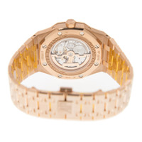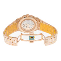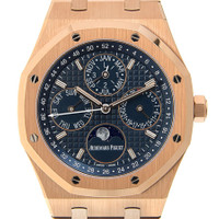 18kt pink gold case with a 18kt pink gold bracelet. 8 screws fixed 18kt pink gold bezel. Blue dial with pink gold hands and index hour markers. Dial Type: Analog. Luminescent hands and markers. Perpetual calendar. Four sub-dials displaying: month, moonphase, date and day of the week. Audemars Piguet Calibre 5134 Automatic movement, based upon Audemars Piguet 2120, containing 38 Jewels, composed of 374 parts, bitting at 19800 vph, and has a power reserve of approximately 40 hours. Scratch resistant sapphire crystal. Screw down crown. Skeleton transparent exhibition see through case back. Octagon case shape, case size: 41 mm, case thickness: 9.5 mm. Deployment with push button release clasp. Water resistant at 200 meters / 660 feet. Functions: perpetual calendar, moon phase, week number, leap year, month, date, day, hour, minute. Royal Oak Prepetual Calendar Series. Luxury watch style. Watch label: Swiss Made. Audemars Piguet Royal Oak Prepetual Calendar Blue Dial Automatic Men's 18 Carat Pink Gold Watch 26574OR.OO.1220OR.02. CASE Case Size: 41 Case Thickness: 9.5 mm Case Material: 18kt Pink Gold Case Shape: Octagon Case Back: Skeleton Transparent Exhibition See Through BAND Band Material: 18kt Pink Gold Band Type: Bracelet Band Color: Pink Clasp: Deployment with Push Button Release DIAL Dial Color: Blue Type: Analog Crystal: Scratch Resistant Sapphire Hands: Pink Gold Dial Markers: Index Sub Dials: Four - Month, Moonphase, Date and Day of the Week Luminiscence: Hands and Markers Bezel: 8 Screws Fixed Bezel Material: 18kt Pink Gold Crown: Screw Down INFORMATION Brand: Audemars Piguet Series: Royal Oak Prepetual Calendar Collection Name: Royal Oak Prepetual Calendar Gender: Mens Model: 26574OR.OO.1220OR.02 Watch Label: Swiss Made Movement: Automatic Engine: Audemars Piguet Calibre 5134 Power Reserve: 40 hours FEATURES Water Resistance: 200 meters / 660 feet Calendar: Perpetual Calendar Functions: Perpetual Calendar, Moon Phase, Week Number, Leap Year, Month, Date, Day, Hour, Minute Watch Features: Analog, Leap Year Indicator, Month, Perpetual, Gold, Moon Phase ADDITIONAL INFO Watch Style: Luxury Warranty: 2 Year Jomashop Warranty Jomashop Sku: AP26574OROO1220OR02 Department: Watches Category: Watches