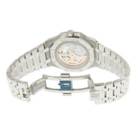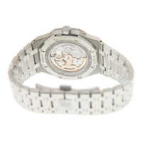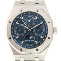 Silver-tone stainless steel case with a silver-tone stainless steel bracelet. 8 screws fixed silver-tone stainless steel bezel. Blue dial with silver-tone hands and index hour markers. Week markers around the outer rim. Dial Type: Analog. Luminescent hands and markers. Perpetual calendar. Four- month, moonphase, date, day of the week subdials. Audemars Piguet Calibre 5134 Automatic movement, based upon Audemars Piguet 2120, containing 38 Jewels, composed of 374 parts, bitting at 19800 vph, and has a power reserve of approximately 40 hours. Scratch resistant sapphire crystal. Screw down crown. Skeleton transparent exhibition see through case back. Octagon case shape, case size: 41 mm, case thickness: 9.5 mm. Deployment with push button release clasp. Water resistant at 200 meters / 660 feet. Functions: perpetual calendar, moon phase, leap year, month, date, day, hour, minute. Luxury watch style. Watch label: Swiss Made. Audemars Piguet Royal Oak Prepetual Calendar Blue Dial Automatic Men's Watch 26574ST.OO.1220ST.02. CASE Case Size: 41 Case Thickness: 9.5 mm Case Material: Stainless Steel Case Shape: Octagon Case Back: Skeleton Transparent Exhibition See Through BAND Band Material: Stainless Steel Band Type: Bracelet Band Color: Silver-tone Clasp: Deployment with Push Button Release DIAL Dial Color: Blue Type: Analog Crystal: Scratch Resistant Sapphire Hands: Silver-tone Dial Markers: Index Second Markers: Week Markers around the outer rim Sub Dials: Four - Month, Moonphase, Date and Day of the Week Luminiscence: Hands and Markers Bezel: 8 Screws Fixed Bezel Color: Silver-tone Bezel Material: Stainless Steel Crown: Screw Down INFORMATION Brand: Audemars Piguet Series: Royal Oak Prepetual Calendar Collection Name: Royal Oak Prepetual Calendar Gender: Mens Model: 26574ST.OO.1220ST.02 Watch Label: Swiss Made Movement: Automatic Engine: Audemars Piguet Calibre 5134 Power Reserve: 40 hours FEATURES Water Resistance: 200 meters / 660 feet Calendar: Perpetual Calendar Functions: Perpetual Calendar, Moon Phase, Leap Year, Month, Date, Day, Hour, Minute Watch Features: Analog, Leap Year Indicator, Month, Perpetual, Stainless Steel, Moon Phase ADDITIONAL INFO Watch Style: Luxury Warranty: 2 Year Jomashop Warranty Jomashop Sku: AP26574STOO1220ST02 Department: Watches Category: Watches