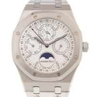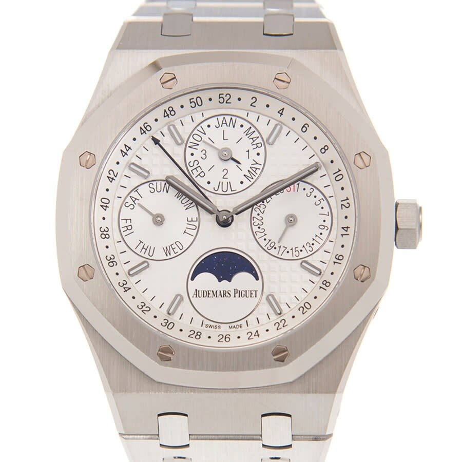 Silver-tone stainless steel case with a silver-tone stainless steel bracelet. 8 screws fixed silver-tone stainless steel bezel. Siver dial with silver-tone hands and index hour markers. Week markers around the outer rim. Dial Type: Analog. Luminescent hands and markers. Perpetual calendar. Four sub-dials displaying: month, moonphase, date, day of the week. Audemars Piguet Calibre 5134 Automatic movement, based upon Audemars Piguet 2120, containing 38 Jewels, composed of 374 parts, bitting at 19800 vph, and has a power reserve of approximately 40 hours. Scratch resistant sapphire crystal. Screw down crown. Skeleton transparent exhibition see through case back. Octagon case shape, case size: 41 mm, case thickness: 9.5 mm. Deployment with push button release clasp. Water resistant at 200 meters / 660 feet. Functions: perpetual calendar, moon phase, leap year, month, date, day, hour, minute. Royal Oak Prepetual Calendar Series. Luxury watch style. Watch label: Swiss Made. Audemars Piguet Royal Oak Prepetual Calendar Silver Dial Automatic Men's Watch 26574ST.OO.1220ST.01. CASE Case Size: 41 Case Thickness: 9.5 mm Case Material: Stainless Steel Case Shape: Octagon Case Back: Skeleton Transparent Exhibition See Through BAND Band Material: Stainless Steel Band Type: Bracelet Band Color: Silver-tone Clasp: Deployment with Push Button Release DIAL Dial Color: Siver Type: Analog Crystal: Scratch Resistant Sapphire Hands: Silver-tone Dial Markers: Index Second Markers: Week Markers around the outer rim Sub Dials: Four - Month, Moonphase, Date and Day of the Week Luminiscence: Hands and Markers Bezel: 8 Screws Fixed Bezel Color: Silver-tone Bezel Material: Stainless Steel Crown: Screw Down INFORMATION Brand: Audemars Piguet Series: Royal Oak Prepetual Calendar Collection Name: Royal Oak Prepetual Calendar Gender: Mens Model: 26574ST.OO.1220ST.01 Watch Label: Swiss Made Movement: Automatic Engine: Audemars Piguet Calibre 5134 Power Reserve: 40 hours FEATURES Water Resistance: 200 meters / 660 feet Calendar: Perpetual Calendar Functions: Perpetual Calendar, Moon Phase, Leap Year, Month, Date, Day, Hour, Minute Watch Features: Analog, Leap Year Indicator, Month, Perpetual, Stainless Steel, Moon Phase ADDITIONAL INFO Watch Style: Luxury Warranty: 2 Year Jomashop Warranty Jomashop Sku: AP26574STOO1220ST01 Department: Watches Category: Watches