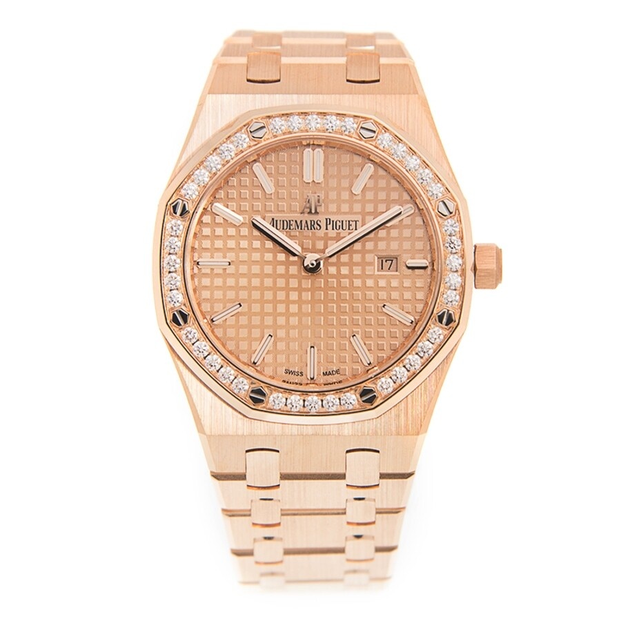18kt rose gold case with a gold-tone 18kt rose gold bracelet. 8 screws fixed 18kt rose gold diamond set bezel. Gold tone dial with rose gold-tone hands and index hour markers. Dial Type: Analog. Date display at the 3 o'clock position. Audemars Piguet Caliber 2713 quartz movement. Scratch resistant sapphire crystal. Solid case back. Octagon case shape, case size: 42 mm x 33 mm, case thickness: 7 mm. Deployment clasp. Water resistant at 50 meters / 165 feet. Functions: date, hour, minute, second. Luxury watch style. Watch label: Swiss Made. Audemars Piguet Royal Oak Quartz Diamond Ladies Watch 67651OR.ZZ.1261OR.03. INFORMATION Brand: Audemars Piguet Series: Royal Oak Collection Name: Royal Oak Gender: Womens Model: 67651OR.ZZ.1261OR.03 Watch Label: Swiss Made Movement: Quartz Engine: Audemars Piguet Caliber 2713 CASE Case Size: 42 mm x 33 mm Case Thickness: 7 mm Case Material: 18kt Rose Gold Case Shape: Octagon Case Back: Solid BAND Band Material: 18kt Rose Gold Band Type: Bracelet Band Color: Gold-tone Clasp: Deployment DIAL Dial Color: Gold Tone Type: Analog Crystal: Scratch Resistant Sapphire Hands: Rose Gold-tone Dial Markers: Index Bezel: 8 Screws Fixed Bezel Color: 18kt Rose Gold Bezel Material: Diamond Set FEATURES Water Resistance: 50 meters / 165 feet Calendar: Date display at the 3 o'clock position Functions: Date, Hour, Minute, Second Watch Features: Diamond, Gold, Analog ADDITIONAL INFO Watch Style: Luxury Warranty: 2 Year Jomashop Warranty Jomashop Sku: AP67651ORZZ1261OR03 Department: Watches Category: Watches