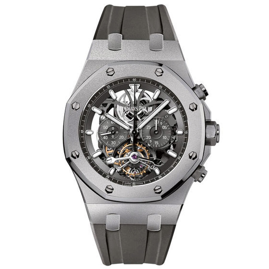 Grey titanium case with a grey rubber strap. 8 screws fixed grey bezel. Slate grey skeleton dial with silver-tone hands and index hour markers. Minute markers around the outer rim. Dial Type: Analog. Luminescent hands and markers. Chronograph - three sub-dials displaying: 60 seconds, 30 minutes, and tourbillion. Audemars Piguet Calibre 2936 Hand Wind movement, based upon Audemars Piguet 2889, containing 28 Jewels, composed of 299 parts, bitting at 21600 vph, and has a power reserve of approximately 72 hours. Scratch resistant sapphire crystal. Screw down crown. Skeleton transparent exhibition see through case back. Octagon case shape, case size: 44 mm, case thickness: 13.2 mm. Water resistant at 200 meters / 660 feet. Functions: tourbillon, chronograph, hour, minute, small second. Luxury watch style. Watch label: Swiss Made. Audemars Piguet Royal Oak Tourbillon Slate Grey Skeleton Dial Men's Watch 26347TI.GG.D004CA.02. CASE Case Size: 44 Case Thickness: 13.2 mm Case Material: Titanium Case Shape: Octagon Case Back: Skeleton Transparent Exhibition See Through BAND Band Material: Rubber Band Type: Strap Band Color: Grey DIAL Dial Color: Slate Grey Skeleton Type: Analog Crystal: Scratch Resistant Sapphire Hands: Silver-tone Dial Markers: Index Second Markers: Minute Markers around the outer rim Sub Dials: Three - 60 Second, 30 Minute and Tourbillion Luminiscence: Hands and Markers Bezel: 8 Screws Fixed Bezel Color: Grey Crown: Screw Down INFORMATION Brand: Audemars Piguet Series: Royal Oak Tourbillon Collection Name: Royal Oak Tourbillon Gender: Mens Model: 26347TI.GG.D004CA.02 Watch Label: Swiss Made Movement: Hand Wind Engine: Audemars Piguet Calibre 2936 Power Reserve: 72 hours FEATURES Water Resistance: 200 meters / 660 feet Functions: Tourbillon, Chronograph, Hour, Minute, Small Second Watch Features: Tourbillon, Chronograph, Titanium, Rubber, Analog ADDITIONAL INFO Watch Style: Luxury Warranty: 2 Year Jomashop Warranty Jomashop Sku: AP26347TIGGD004CA02 Department: Watches Category: Watches