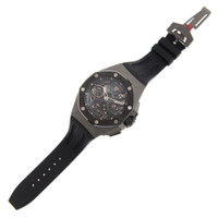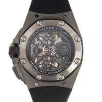 Grey titanium case with a black rubber strap. Fixed black ceramic bezel. Black dial with silver-tone hands and stick hour markers. Minute markers around the outer rim. Dial Type: Analog. Luminescent hands and markers. Three sub-dials displaying: tourbillon, GMT and functions selection. Audemars Piguet Calibre 2913 Automatic movement, containing 29 Jewels, composed of 291 parts, bitting at 21600 vph, and has a power reserve of approximately 237 hours. Scratch resistant sapphire crystal. Screw down crown. Skeleton case back. Octagon case shape, case size: 44 mm, case thickness: 16.1 mm. Deployment with push button release clasp. Water resistant at 100 meters / 330 feet. Functions: tourbillon, GMT, second time zone, hour, minute, second. Tourbillon Concept Series. Luxury watch style. Watch label: Swiss Made. Audemars Piguet Tourbillon Concept Automatic Black Dial Men's Watch 26589IOOOD002CA01. CASE Case Size: 44 Case Thickness: 16.1 mm Case Material: Titanium Case Shape: Octagon Case Back: Skeleton BAND Band Material: Rubber Band Type: Strap Band Color: Black Clasp: Deployment with Push Button Release DIAL Dial Color: Black Type: Analog Crystal: Scratch Resistant Sapphire Hands: Silver-tone Dial Markers: Stick Second Markers: Minute Markers around the outer rim Sub Dials: Three - Tourbillon, GMT and Functions Selection Luminiscence: Hands and Markers Bezel: Fixed Bezel Color: Black Bezel Material: Ceramic Crown: Screw Down INFORMATION Brand: Audemars Piguet Series: Tourbillon Concept Collection Name: Tourbillon Concept Gender: Mens Model: 26589IO.OO.D002CA.01 Watch Label: Swiss Made Movement: Automatic Engine: Audemars Piguet Calibre 2913 Power Reserve: 237 hours FEATURES Water Resistance: 100 meters / 330 feet Functions: Tourbillon, GMT, Second Time Zone, Hour, Minute, Second Watch Features: Analog, GMT, Ceramic, Rubber, Titanium, Tourbillon, Time Zone ADDITIONAL INFO Watch Style: Luxury Warranty: 2 Year Jomashop Warranty Jomashop Sku: AP26589IOOOD002CA01 Department: Watches Category: Watches