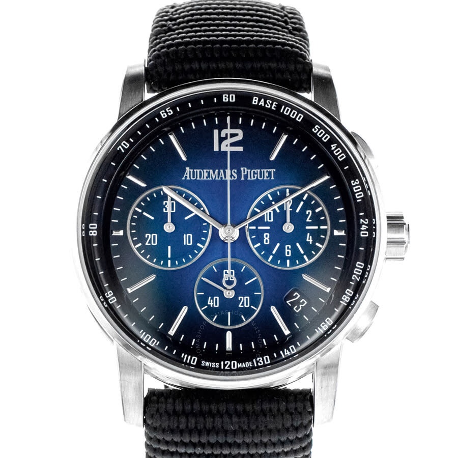 18kt white gold case with a black rubber strap. Fixed 18kt white gold bezel. Blue dial with silver-tone hands and index hour markers. Minute markers around the outer rim. Dial Type: Analog. Date display between 4 and 5 o'clock position. Chronograph - three sub-dials displaying: 60 second, 30 minute and 12 hour. Audemars Piguet Calibre 4401 Automatic movement, containing 40 Jewels, composed of 367 parts, bitting at 28800 vph, and has a power reserve of approximately 70 hours. Scratch resistant sapphire crystal. Transparent see through case back. Round case shape, case size: 41 mm. Buckle clasp. Water resistant at 30 meters / 100 feet. Functions: chronograph, column wheel, flyback, date, hour, minute, second. Code 11.59 Series. Luxury watch style. Watch label: Swiss Made. Pre-owned Audemars Piguet Code 11.59 Chronograph Automatic Blue Dial Men's Watch 26393BC.OO.A002KB.01. GENERAL Collection Name: Code 11.59 INFORMATION Brand: Audemars Piguet Series: Code 11.59 Model: 26393BC.OO.A002KB.01 Gender: Mens Watch Label: Swiss Made Movement: Automatic Engine: Audemars Piguet Calibre 4401 Power Reserve: 70 hours CONDITION INFORMATION Box: Yes Preowned Item Condition: Very Good Papers: Yes Year: 2022 Comments: This Audemars Piguet Code 11.59, reference number 26393BC, has a manufacturer year of 2022. Box Included, Papers Included . This watch has a 41mm White Gold Case with White gold bezel, Blue Arabic numerals dial and Textile bracelet with Buckle. The Automatic movement has Chronograph function. The wrist measures 7.5 inches or 19.05 centimeters. The condition is Very Good The watch listed is in stock and the pictures shown are of the actual watch for sale. All of our watches have been thoroughly CASE Case Size: 41 Case Material: 18kt White Gold Case Shape: Round Case Back: Transparent See Through DIAL Type: Analog Dial Color: Blue Crystal: Scratch Resistant Sapphire Hands: Silver-tone Second Markers: Minute Markers around the outer rim Dial Markers: Index Sub Dials: Three - 60 Second, 30 Minute and 12 Hour Bezel: Fixed Bezel Material: 18kt White Gold BAND Band Type: Strap Band Material: Rubber Band Color: Black Clasp: Buckle FEATURES Water Resistance: 30 meters / 100 feet Calendar: Date display between 4 and 5 o'clock position Functions: Chronograph, Column Wheel, FlyBack, Date, Hour, Minute, Second Watch Features: Analog, Flyback, Gold, Rubber, Chronograph ADDITIONAL INFO Watch Style: Luxury Warranty: 1 Year Jomashop Warranty Jomashop Sku: PRE-P-AP96585 Department: Watches
