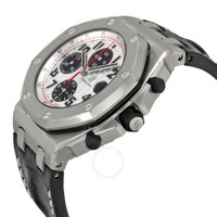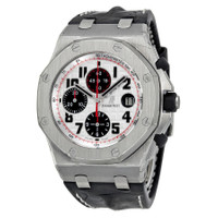 Pre-owned Stainless steel case with a black ("hornback" alligator) leather strap. Fixed stainless steel bezel. Silver dial with silver-tone with black fill hands and Arabic numeral hour markers. Minute markers. Tachymeter around the outer rim. Dial Type: Analog. Luminescent hands and markers. Date display at the 3 o'clock position. Chronograph - three black sub-dials displaying: 60 second, 30 minute and 12 hour. Automatic movement with a 50-hour power reserve. Scratch resistant sapphire crystal. Screw down black rubber clad crown. Solid case back. Case diameter: 42 mm. Case thickness: 14.30 mm. Octagonal case shape. Fold over clasp. Water resistant at 100 meters/ 330 feet. Functions: chronograph, tachymeter, date, hour, minute, small seconds. Sport watch style. Watch label: Swiss Made. Audemars Piguet Royal Oak Offshore Silver-Tone Dial Men's Watch 26170ST.OO.D101CR.02. GENERAL Collection Name: Royal Oak Offshore INFORMATION Brand: Audemars Piguet Series: Royal Oak Offshore Model: 26170ST.OO.D101CR.02 Gender: Mens Watch Label: Swiss Made Movement: Automatic Engine: Audemars Piguet Calibre 3126/3840 Power Reserve: 50 hours CONDITION INFORMATION Box: Yes Preowned Item Condition: Excellent Papers: Yes Year: 2010 CASE Case Size: 42 mm Case Thickness: 14.3 mm Case Material: Stainless Steel Case Shape: Octagon Case Back: Solid DIAL Type: Analog Dial Color: Silver Crystal: Scratch Resistant Sapphire Hands: Silver-tone with Black Fill Second Markers: Minute Markers. Tachymeter around the outer rim Dial Markers: Arabic Numeral Sub Dials: Three - 60 Second, 30 Minute and 12 Hour Luminiscence: Hands and Markers Bezel: Fixed Bezel Color: Silver-tone Bezel Material: Stainless Steel Crown: Screw Down Black Rubber Clad BAND Band Type: Strap Band Material: ("Hornback" Alligator) Leather Band Color: Black Band Width: 20.3 mm Clasp: Fold Over FEATURES Water Resistance: 100 meters / 330 feet Calendar: Date display at the 3 o'clock position Functions: Chronograph, Tachymeter, Date, Hour, Minute, Small Second Watch Features: Alligator Leather, Analog, Leather, Rubber, Stainless Steel, Chronograph ADDITIONAL INFO Watch Style: Sport Warranty: 1 Year Jomashop Warranty UPC Code: 845960053709 Jomashop Sku: PRE-P-AP58176 Department: Watches Category: Watches