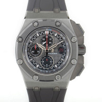 Pre-owned Titanium case with a grey rubber strap. Fixed cermet bezel. Grey dial with grey-toned hands and index hour markers. Tachymeter scale and minute markers around the outer rim. Dial Type: Analog. Luminescent hands and markers. Date display at the 3 o'clock position. Chronograph - three sub-dials displaying: 60 second, 30 minute and 12 hour. Automatic movement. Scratch resistant sapphire crystal. Case diameter: 44 mm. Case thickness: 15.65 mm. Octagon case shape. Tang titanium clasp. Water resistant at 100 meters / 330 feet. Functions: chronograph, date, hour, minute, second. Luxury watch style. Watch label: Swiss Made. Audemars Piguet Michael Schumacher Grey Dial Men's Watch 26568IM.OO.A004CA.01. GENERAL Collection Name: Royal Oak Offshore Michael Schumacher INFORMATION Brand: Audemars Piguet Series: Royal Oak Offshore Michael Schumacher Model: 26568IM.OO.A004CA.01 Gender: Mens Watch Label: Swiss Made Movement: Automatic Engine: Audemars Piguet Calibre 3126/3840 Power Reserve: 55 hours CONDITION INFORMATION Box: No Preowned Item Condition: Excellent Papers: No CASE Case Thickness: 15.65 mm Case Material: Titanium Case Shape: Octagon DIAL Type: Analog Dial Color: Grey Crystal: Scratch Resistant Sapphire Hands: Grey-toned Second Markers: Tachymeter Scale and Minute Markers around the outer rim Dial Markers: Index Sub Dials: Three - 60 Second, 30 Minute and 12 Hour Luminiscence: Hands and Markers Bezel: Fixed Cermet BAND Band Type: Strap Band Material: Rubber Band Color: Grey Clasp: Tang Titanium FEATURES Water Resistance: 100 meters / 330 feet Calendar: Date display at the 3 o'clock position Functions: Chronograph, Date, Hour, Minute, Small Second Watch Features: Analog, Rubber, Titanium, Chronograph ADDITIONAL INFO Watch Style: Luxury Warranty: 1 Year Jomashop Warranty Jomashop Sku: PRE-P-AP99573 Department: Watches