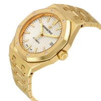 Pre-owned 18kt yellow gold case with a 18kt yellow gold bracelet. Fixed 18kt yellow gold bezel. Silver dial with gold-tone hands and index hour markers. Minute markers around the outer rim. Dial Type: Analog. Luminescent hands and markers. Date display at the 3 o'clock position. Audemars Piguet calibre 3120 automatic movement with a 60-hour power reserve. Scratch resistant sapphire crystal. Screw down crown. Transparent case back. Case size: 37 mm. Case thickness: 9.80 mm. Octagon case shape. Fold over clasp with a safety release. Water resistant at 50 meters / 165 feet. Functions: date, hour, minute, second. Luxury watch style. Watch label: Swiss Made. Audemars Piguet Royal Oak Silver Dial Automatic 18 Carat Yellow Gold Ladies Watch 15450BA.OO.1256BA.01. GENERAL Year: 2019 Preowned Item Condition: Mint CASE Case Thickness: 9.8 mm Case Material: 18kt Yellow Gold Case Shape: Octagon Case Back: Transparent BAND Band Material: 18kt Yellow Gold Band Type: Bracelet Band Color: Yellow Gold-tone Clasp: Fold Over with Safety Release DIAL Dial Color: Silver Type: Analog Crystal: Scratch Resistant Sapphire Hands: Yellow Gold-tone Dial Markers: Index Second Markers: Minute Markers around the outer rim Luminiscence: Hands and Markers Bezel: Fixed Bezel Color: Yellow Gold-tone Bezel Material: 18kt Yellow Gold Crown: Screw Down INFORMATION Brand: Audemars Piguet Series: Royal Oak Collection Name: Royal Oak Gender: Womens Model: 15450BA.OO.1256BA.01 Watch Label: Swiss Made Movement: Automatic Engine: Audemars Piguet Calibre 3120 Power Reserve: 60 hours FEATURES Water Resistance: 50 meters / 165 feet Calendar: Date display at the 3 o'clock position Functions: Date, Hour, Minute, Second Watch Features: Analog, Gold ADDITIONAL INFO Watch Style: Luxury Warranty: 1 Year Jomashop Warranty UPC Code: 842047110560 Jomashop Sku: PRE-P-AP104358 Department: Watches Category: Watches