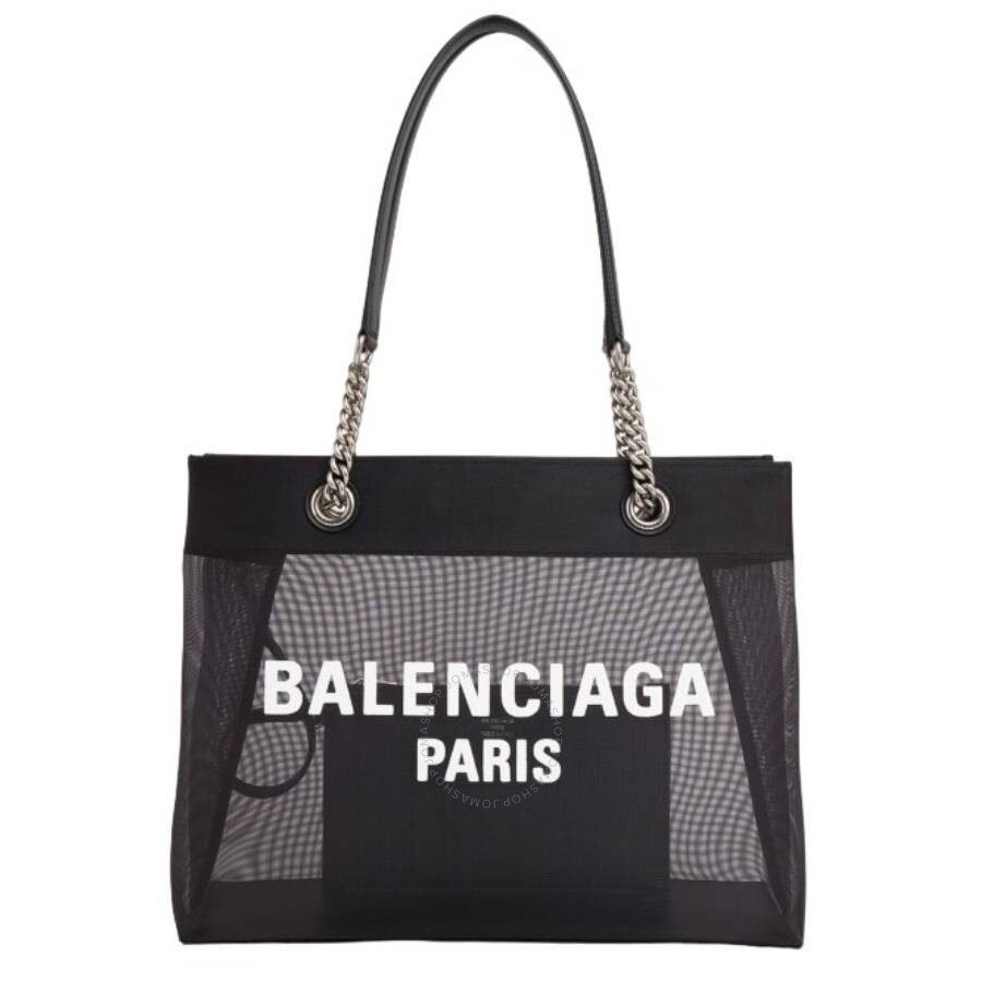 Balenciaga Ladies Tote. SKU: 741602 2AADB 1090. Color: Black. Size: 35 cm x 27 cm x 14 cm. The Duty Free medium tote bag, crafted with breathable mesh accented by luxurious leather details. This versatile tote boasts a chic chain and leather shoulder strap, adorned with subtle logo embellishments for a touch of sophistication. Designed with practicality in mind, it includes sturdy metal feet for added durability and a detachable internal pouch for effortless organization. Outer: 95% Polyester, 5% Lambskin. Made in Italy. GENERAL Size Info: 35 cm x 27 cm x 14 cm Color: Black INFORMATION Brand: Balenciaga Gender: Womens Model: 741602 2AADB 1090 DETAILS Material: Lambskin, Polyester Closure: Open DIMENSIONS Size: Medium ADDITIONAL INFO Jomashop Sku: Z-J87D3 Department: Bags Category: Tote Bags