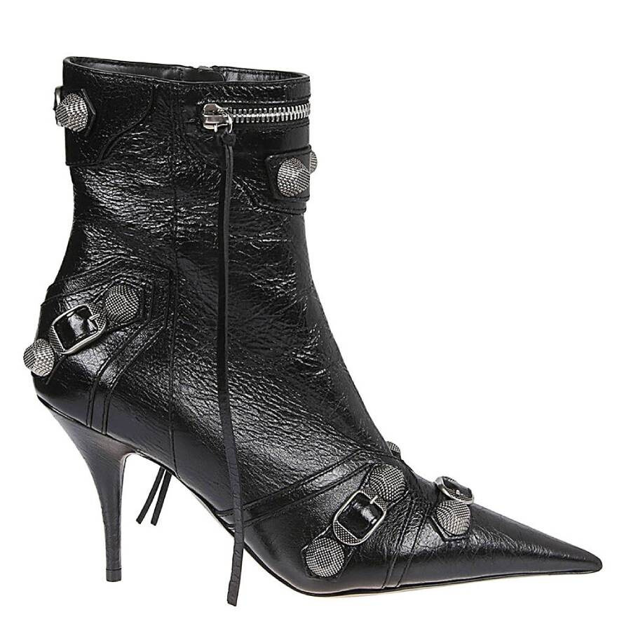 Balenciaga Ladies Boots. SKU: 694379 WAD4E 1081. Color: Black/Aged Nikel. Balenciaga Cagole 90 Booties. Modern and sleek, these booties are crafted from arena lamb leather with an elongated tip and signature Cagole buckles. Featuring a side zip closure, smooth leather interior, embossed Balenciaga logo on the insole, and a stiletto kitten heel. Finished with a genuine leather sole. Made in Italy. Please visit the brand website for sizing information. GENERAL Brand Type: Designer INFORMATION Brand: Balenciaga Model: 694379 WAD4E 1081 Gender: Womens DETAILS Category: Boots Color: Black/Aged Nikel ADDITIONAL INFO Jomashop Sku: -694379WAD4E1081 Department: Shoes