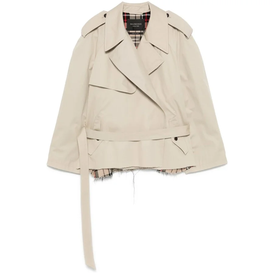 Balenciaga Ladies Outerwear. Fashion category: Coats & Jackets. SKU: 814615 TBP01 9501. Color: Beige. Balenciaga Long Sleeve Cropped Trench Coat. This cropped cotton twill trench coat features a checkered print cotton lining, pockets, and long sleeves with dropped shoulders. Designed in a cropped robe style, it comes with a belt and a raw-cut hem for an unfinished, edgy look. Material: Cotton. Made in Italy. GENERAL Brand Type: Designer Color: Beige INFORMATION Brand: Balenciaga Gender: Womens Model: 814615 TBP01 9501 DETAILS Category: Outerwear Apparel Type: Coats & Jackets Material: Cotton ADDITIONAL INFO Jomashop Sku: -814615TBP019501 Department: Clothing