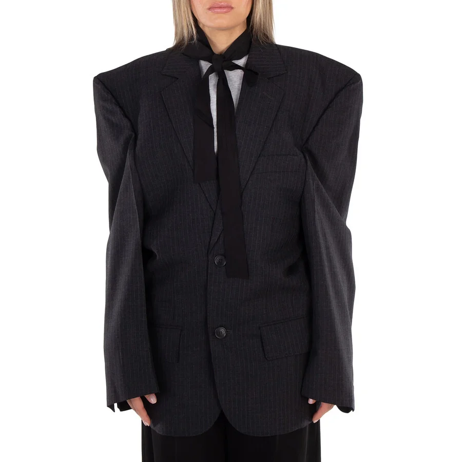 Balenciaga Ladies Outerwear. Fashion category: Blazers. SKU: 790912 TQT12 1140. Color: Anthracite. Balenciaga Ladies Anthracite Cut Away Boxy Blazer. The cut-away blazer is crafted from wool and features a pinstripe print with a boxy fit. It has notched lapels, shoulder pads, a chest welt pocket, long sleeves with buttoned cuffs, and two side flap pockets. The blazer also includes a central rear vent, logo-jacquard lining, a straight hem, and a front button fastening. Wool 100% Made in Italy. GENERAL Size Info: Small Clothing Size: Ladies Apparel Size: S Color: Anthracite INFORMATION Brand: Balenciaga Gender: Womens Model: 790912 TQT12 1140 DETAILS Category: Outerwear Apparel Type: Blazers Material: Wool ADDITIONAL INFO Jomashop Sku: Z-HVM8G Department: Clothing