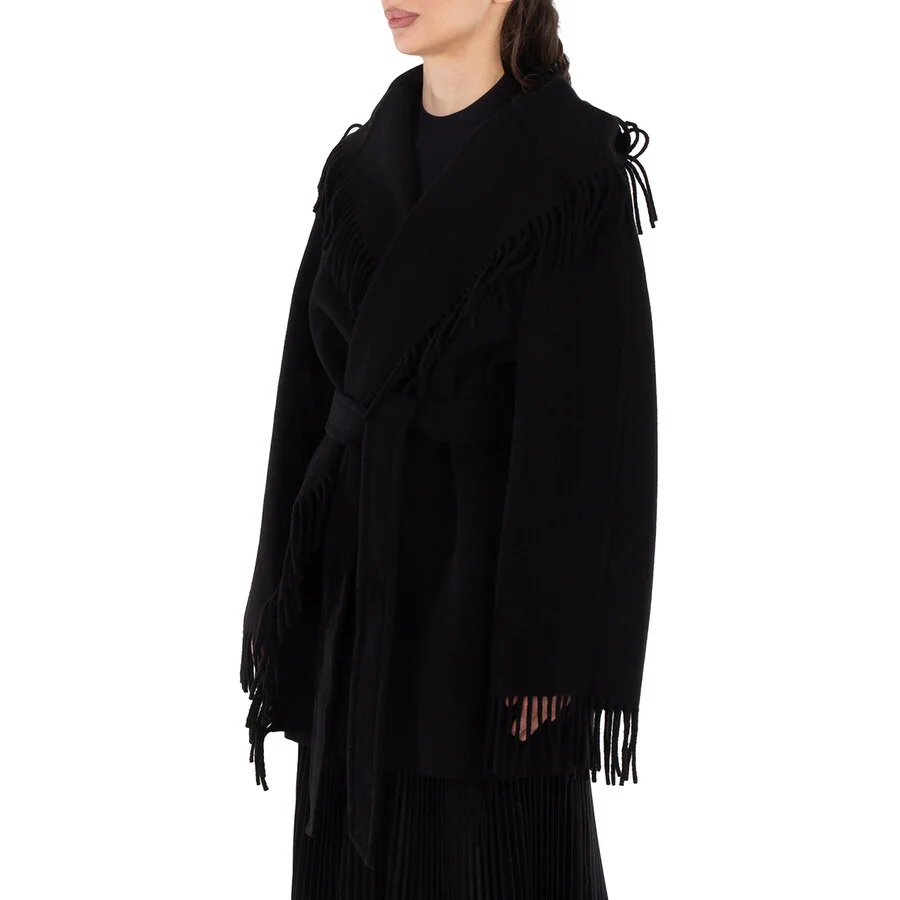 Balenciaga Ladies Outerwear. Fashion category: Coats & Jackets. SKU: 772968 TPU04 1000. Color: Black. Balenciaga Ladies Black Fringed-Edge Hooded Cardi-Coat. The cardi-coat is crafted from wool and features a classic hood, a wrap design, and a belted waist. It has long sleeves, a fringed edge, and a straight hem. Wool 100% Made in Italy. GENERAL Size Info: Small Clothing Size: Ladies Apparel Size: S Color: Black INFORMATION Brand: Balenciaga Gender: Womens Model: 772968 TPU04 1000 DETAILS Category: Outerwear Apparel Type: Coats & Jackets Material: Wool ADDITIONAL INFO Jomashop Sku: Z-K98H8 Department: Clothing