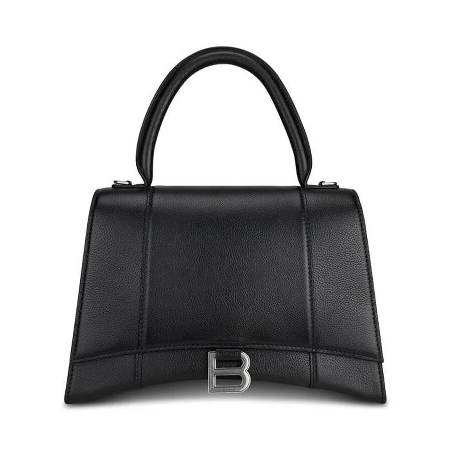 Brand: Balenciaga. SKU: 619668-1IZHY-1000. Color: Black. Balenciaga Ladies Hourglass Top Handle Bag In Black. This Black grained leather bag from Balenciaga features a fold-over flap top with B logo magnetic button closure, one handle, adjustable and removable strap, hourglass shape, one rear pocket, one internal zip pocket, two internal patch pocket and one main compartment. Dimensions : L 10,6 x H 7,8 x W 3,9 inch. Made in Italy GENERAL Size Info: L 10,6 x H 7,8 x W 3,9 inch Brand Type: Designer Color: Black INFORMATION Brand: Balenciaga Gender: Womens Model: 619668-1IZHY-1000 DETAILS Material: Leather Closure: Magnetic Snap DIMENSIONS Size: Small ADDITIONAL INFO Jomashop Sku: Z-U3TZC Department: Bags Category: Crossbody