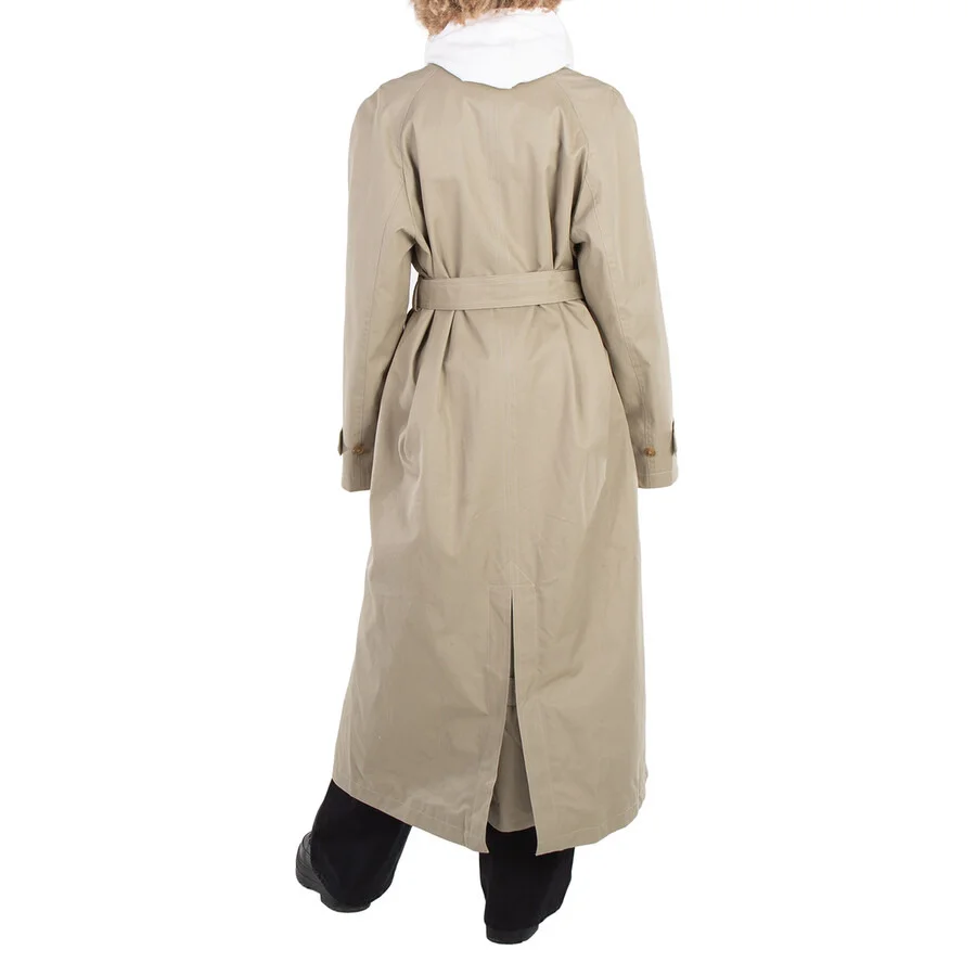 Balenciaga Ladies Outerwear. Fashion category: Coats & Jackets. SKU: 773216 TKP06 2801. Color: Military Beige. Balenciaga Ladies Military Beige Belted Cotton Trench Coat. Crafted from a cotton/wool blend, this trench coat features a collarless design, front button fastening, long raglan sleeves with belted cuffs, and a belted waist. It also includes two side slit pockets, a central rear vent, a straight hem, and an ankle-length silhouette, finished with a checked lining. Cotton 100% Made in Italy. GENERAL Clothing Size: Ladies Apparel Size: 0 Color: Military Beige INFORMATION Brand: Balenciaga Gender: Womens Model: 773216 TKP06 2801 DETAILS Category: Outerwear Apparel Type: Coats & Jackets ADDITIONAL INFO Jomashop Sku: Z-A7K7E Department: Clothing