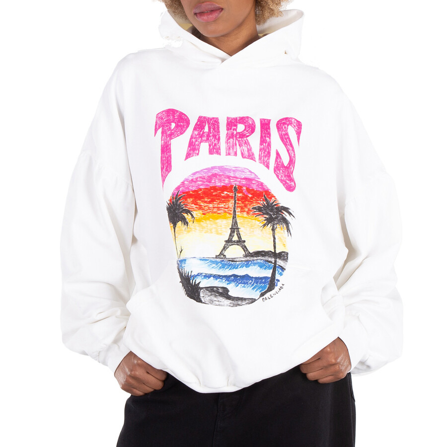 Balenciaga Ladies Tops. Fashion category: Hoodies & Sweatshirts. SKU: 761458 TPVM1 9601. Balenciaga Ladies Paris Tropical Cotton Hoodie. Crafted from cotton fleece with a washed effect, this hoodie features a logo print on the rear and a graphic print on the front. It includes a classic hood, a front pouch pocket, long sleeves, ribbed cuffs and hem, and a straight hem. Cotton 100% INFORMATION Brand: Balenciaga Gender: Womens Model: 761458 TPVM1 9601 DETAILS Category: Tops Apparel Type: Hoodies & Sweatshirts Material: Cotton ADDITIONAL INFO Jomashop Sku: -761458TPVM19601 Department: Clothing