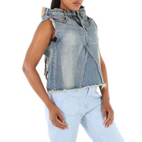 Balenciaga Ladies Tops. SKU: 719270 TNW01 4268. Color: True Blue. Balenciaga Ladies True Blue Sleeveless Denim Asymmetrical Top. This top features an asymmetric neck, sleeveless design, frayed hem, five slip pockets, button fastenings, loose-fitting, a pants-like silhouette, and draped design. GENERAL Color: True Blue INFORMATION Brand: Balenciaga Gender: Womens Model: 719270 TNW01 4268 DETAILS Category: Tops Apparel Type: Shirts & Blouses ADDITIONAL INFO Jomashop Sku: -719270TNW014268 Department: Apparel