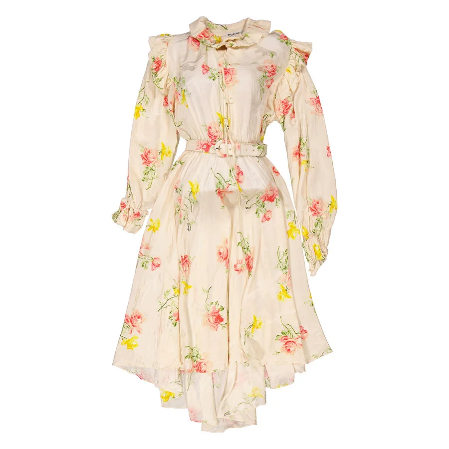 Balenciaga Ladies Dresses. SKU: 660121 TJL76 5630. Color: Multicolor. Balenciaga Ladies Vintage Flower Off-Shoulder Dress. Crafted from lightweight silk, this dress features an asymmetric neck, front tie fastening, ruffled detailing, long sleeves with elasticated cuffs, elasticated belted waist, mid-length, asymmetric hem, crinkled finish and all-over floral embroidery. Silk 100% Made in Italy. GENERAL Color: Multicolor INFORMATION Brand: Balenciaga Gender: Womens Model: 660121 TJL76 5630 DETAILS Category: Dresses Apparel Type: Casual Dresses ADDITIONAL INFO Jomashop Sku: -BLN660121TJL765630 Department: Apparel