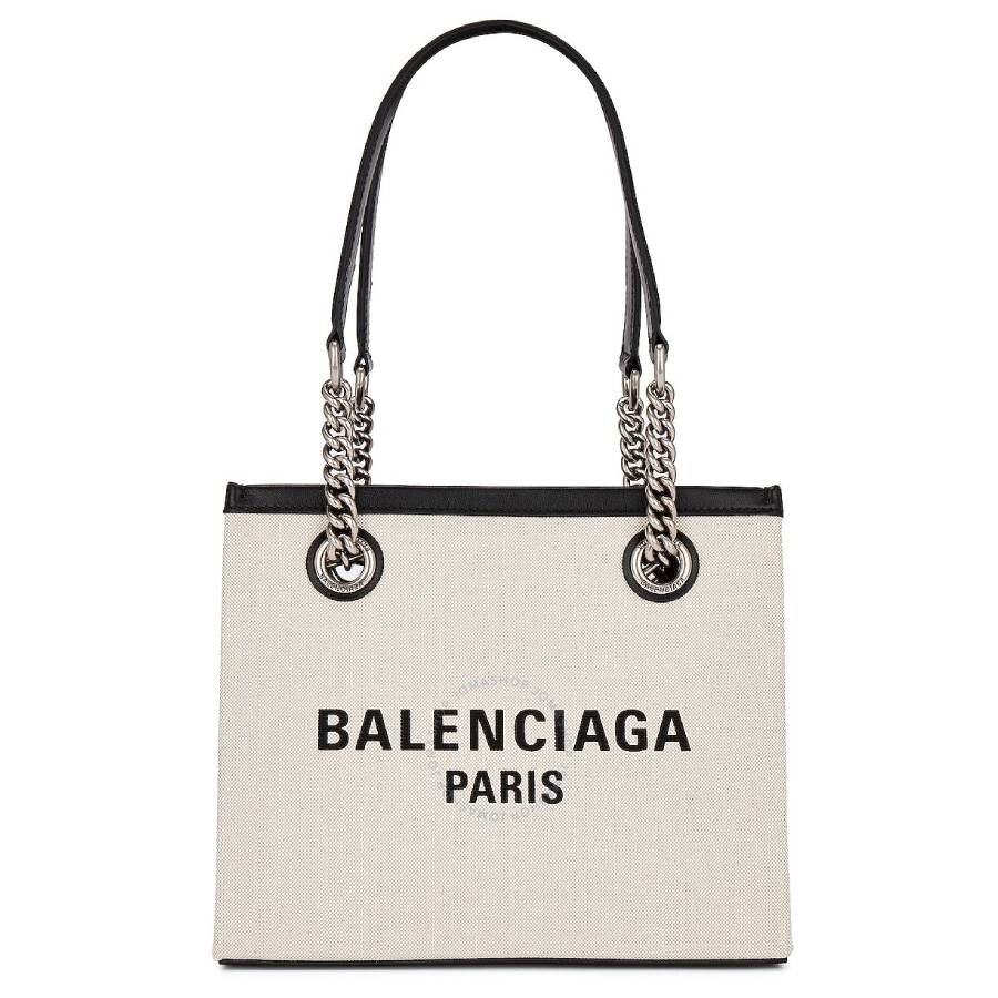 Balenciaga Ladies Tote. SKU: 759941 2AAOK 9260. Color: Naturel. Size: 9" W x 7.5" H x 4" D. Balenciaga Naturel Duty Free Small Logo Tote Bag. Crafted in Italy, this Duty Free small tote features a canvas exterior complemented by a smooth leather lining, an open top design, an interior zipper pocket, top handles adorned with silver-tone chain link detail, and a front Balenciaga Paris logo. Made in Italy. GENERAL Size Info: 9" W x 7.5" H x 4" D Color: Naturel INFORMATION Brand: Balenciaga Gender: Womens Model: 759941 2AAOK 9260 DETAILS Material: Fabric Closure: Open DIMENSIONS Size: Small ADDITIONAL INFO Jomashop Sku: Z-VXR3K Department: Bags Category: Tote Bags