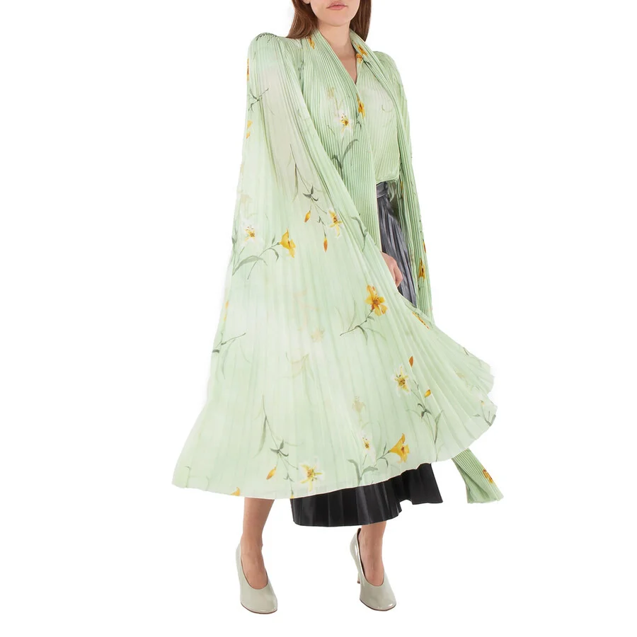Balenciaga Ladies Tops. Fashion category: Shirts & Blouses. SKU: 768704 TPL32 3001. Color: Green. Balenciaga Scarf Pleated Blouse. This blouse features a single back hook-and-eye closure, padded shoulders, and oversized sleeves. Crafted from georgette fabric, it has a draped cape detail for a fluid, elegant look. 100% POLYESTER. Made in Italy. GENERAL Brand Type: Designer Clothing Size: Ladies Apparel Size: 0 Color: Green INFORMATION Brand: Balenciaga Gender: Womens Model: 768704 TPL32 3001 DETAILS Category: Tops Apparel Type: Shirts & Blouses Material: Polyester ADDITIONAL INFO UPC Code: 3666620233852 Jomashop Sku: Z-NCKWA Department: Clothing