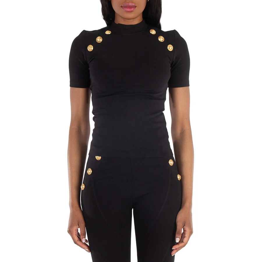Balmain Ladies Tops. Fashion category: T-Shirts & Henleys. SKU: CF1EF090JH30-NOIR. Color: Black. Balmain 6-Button Raglan-Sleeve T-Shirt. This T-shirt features a stretch design, high neck, embossed gold-tone buttons, short raglan sleeves, and a straight hem. Polyamide 49%, Cotton 39%, Spandex/Elastane 12% GENERAL Color: Black INFORMATION Brand: Balmain Gender: Womens Model: CF1EF090JH30-NOIR DETAILS Category: Tops Apparel Type: T-Shirts & Henleys Material: Spandex/Elastane, Cotton, Polyamide ADDITIONAL INFO Jomashop Sku: -CF1EF090JH30NOIR Department: Clothing