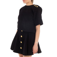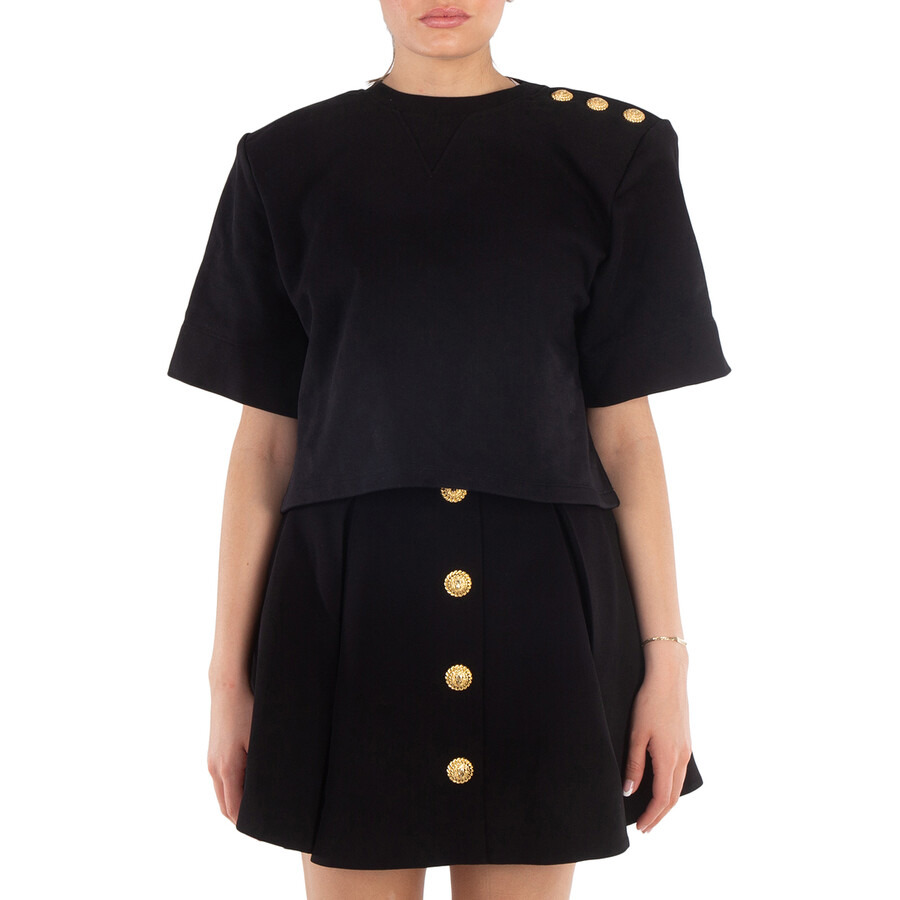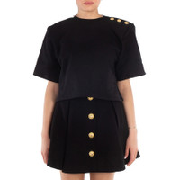 Balmain Ladies Tops. Fashion category: T-Shirts & Henleys. SKU: DF1EE101JB53-NOIR. Color: Noir. Balmain Button-Detail Cropped Crew-Neck Sweatshirt. This cotton t-shirt features embossed buttons, a crew neck, short sleeves, a cropped design, and a straight hem. 100% Cotton. GENERAL Color: Noir INFORMATION Brand: Balmain Gender: Womens Model: DF1EE101JB53-NOIR DETAILS Category: Tops Apparel Type: T-Shirts & Henleys Material: Cotton ADDITIONAL INFO Jomashop Sku: -DF1EE101JB53NOIR Department: Clothing