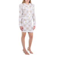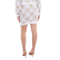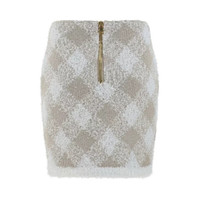 Balmain Ladies Bottoms. Fashion category: Skirts. SKU: DF0LB015KH66-BLANC/ BEIGE. Color: Blanc/ Beige. Balmain Check Pattern Ribbed Hem Mini Skirt. This skirt is made of tweed with a gingham check pattern, metallic threading, a short rear zip fastening, two front welt pockets with lion head motif buttons, and a ribbed hem. 47% Polyamide, 42% Viscose, 8% Polyester, 3% Metallized Polyester. Made in France. GENERAL Color: Blanc/ Beige INFORMATION Brand: Balmain Gender: Womens Model: DF0LB015KH66-BLANC/ BEIGE DETAILS Category: Bottoms Apparel Type: Skirts Material: Polyamide, Polyester, Viscose ADDITIONAL INFO Jomashop Sku: -LB015KH66BLANCBEIGE Department: Clothing