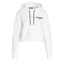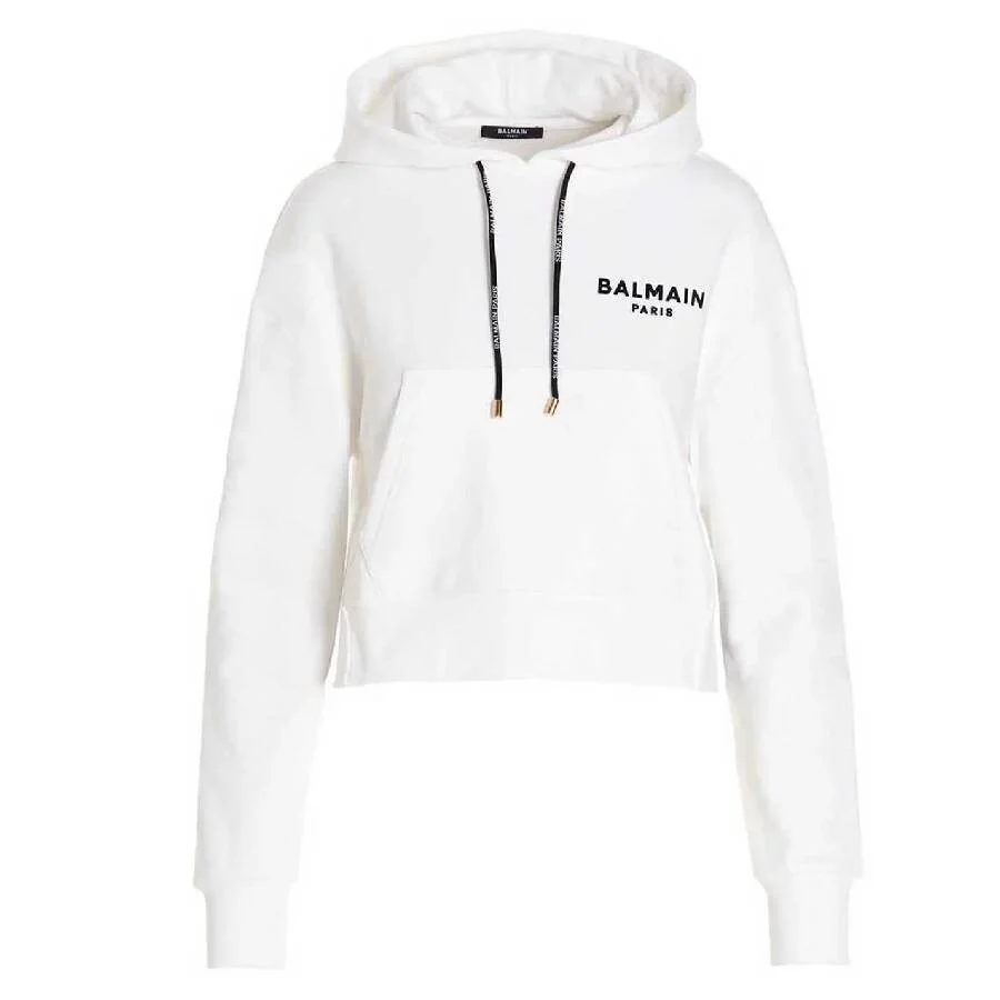 Balmain Ladies Tops. Fashion category: Hoodies & Sweatshirts. SKU: XF0JP000BB01-GAB. Color: Gab Blanc/Noir. Balmain Cropped Cotton Flock Hoodie. This eco-designed cropped cotton sweatshirt features long sleeves, a drawstring hood, and ribbed details, accented with a flocked white Balmain logo. 100% cotton. Made in Portugal. GENERAL Brand Type: Designer Color: Gab Blanc/Noir INFORMATION Brand: Balmain Gender: Womens Model: XF0JP000BB01-GAB DETAILS Category: Tops Apparel Type: Hoodies & Sweatshirts Material: Cotton ADDITIONAL INFO Jomashop Sku: -XF0JP000BB01GAB Department: Clothing