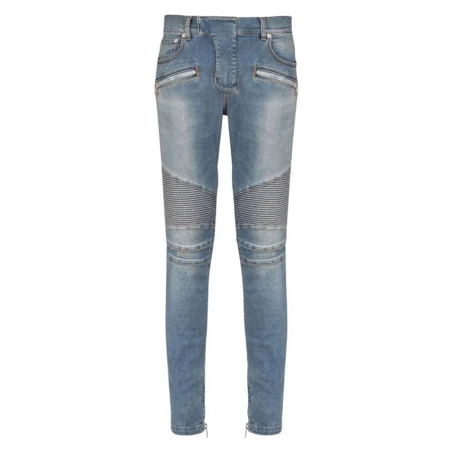 Balmain Men's Bottoms. Fashion category: Jeans & Denim. SKU: EH1MG115DF44-BLEU JEAN. Color: Bleu Jean. Balmain Denim Slim-Fit Biker Jeans. This denim biker jeans feature a waistband with belt loops, including a distinctive triple belt loop at the back. They fasten with a zip and press-stud closure concealed under a placket. The jeans include five classic pockets, with two back pockets featuring zips, and two additional visible zip pockets on the front, each finished with Balmain Paris-engraved sliders. Ribbed detailing at the knees and back enhances the signature biker style, while visible ankle zips add a bold edge. The design is completed with a woven vintage Balmain label, engraved rivets, and silver-tone hardware for a refined finish. 98% cotton 2% elastane. Made in Italy. GENERAL Brand Type: Designer Color: Bleu Jean INFORMATION Brand: Balmain Gender: Mens Model: EH1MG115DF44-BLEU JEAN DETAILS Category: Bottoms Apparel Type: Jeans & Denim Material: Cotton, Elastane ADDITIONAL INFO Jomashop Sku: -H1MG115DF44BLEUJEAN Department: Clothing