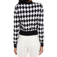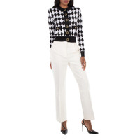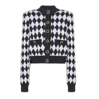 Balmain Ladies Tops. Fashion category: Cardigans & Sweaters. SKU: DF1KL133KG60-NOIR/BLANC. Color: Noir/Blanc. Balmain Diamond-Intarsia Virgin Wool Cardigan. This virgin wool cardigan features an intarsia knit with a diamond pattern, a lion head motif, faux pocket details, ribbed trim, a round neck, front button fastening, long sleeves, and a straight hem. 100% Virgin Wool. Made in Italy. GENERAL Color: Noir/Blanc INFORMATION Brand: Balmain Gender: Womens Model: DF1KL133KG60-NOIR/BLANC DETAILS Category: Tops Apparel Type: Cardigans & Sweaters Material: Wool ADDITIONAL INFO Jomashop Sku: -1KL133KG60NOIRBLANC Department: Clothing