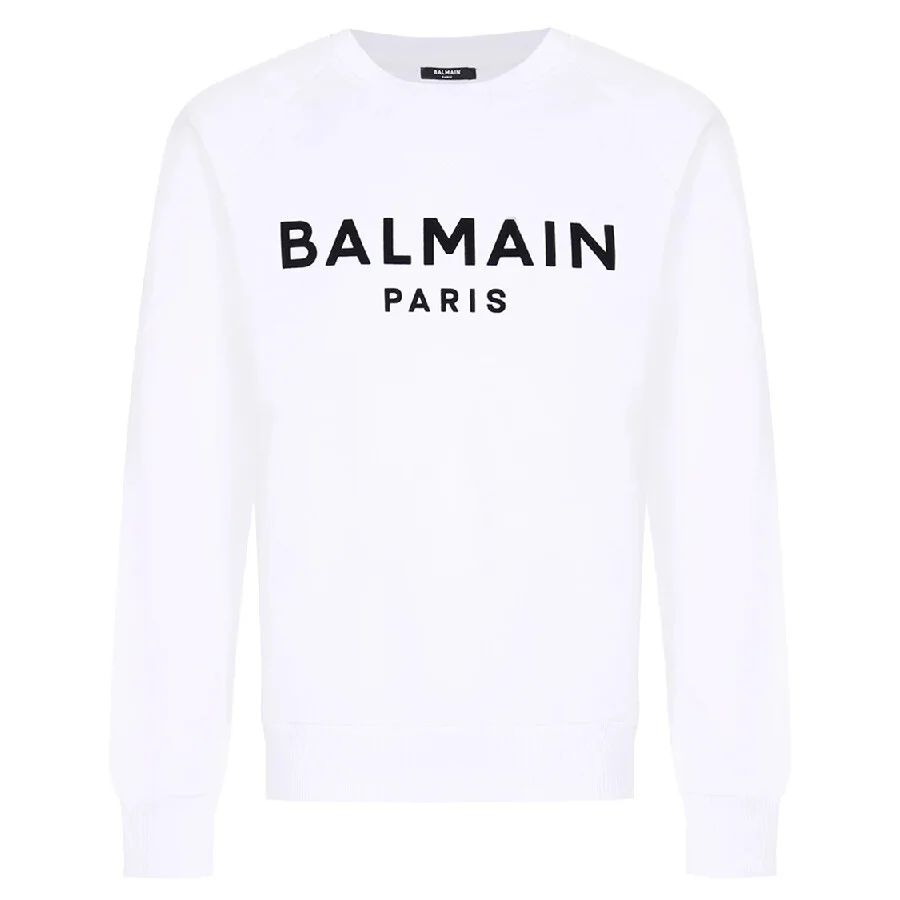 Balmain Men's Tops. Fashion category: Cardigans & Sweaters. SKU: XH1JQ005BB33-GAB. Color: Gab White/Black. Balmain Flock Logo Print Sweatshirt. This sweatshirt features long sleeves, ribbed edges, and a round neck. 100% cotton. Made in Portugal. GENERAL Size Info: Medium Brand Type: Designer Clothing Size: Men's Apparel Size: M Color: Gab White/Black INFORMATION Brand: Balmain Gender: Mens Model: XH1JQ005BB33-GAB DETAILS Category: Tops Apparel Type: Cardigans & Sweaters Material: Cotton ADDITIONAL INFO UPC Code: 3615881930673 Jomashop Sku: Z-48PW2 Department: Clothing