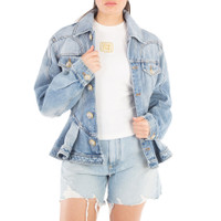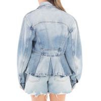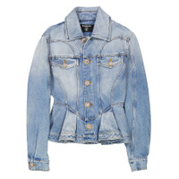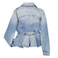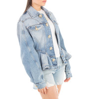 Balmain Ladies Outerwear. Fashion category: Blazers. SKU: DF1SI560DE53-BLEU JEAN CLAIR. Color: Bleu Jean Clair. Balmain Logo-Buttons Pleated Denim Blazer. This cotton denim blazer features logo-engraved buttons, pleat detailing, and a classic collar. It has long sleeves with buttoned cuffs, a front button fastening, two chest flap pockets, and a ruffle hem. Cotton 100% Made in Italy. GENERAL Color: Bleu Jean Clair INFORMATION Brand: Balmain Gender: Womens Model: DF1SI560DE53-BLEU JEAN CLAIR DETAILS Category: Outerwear Apparel Type: Blazers Material: Cotton ADDITIONAL INFO Jomashop Sku: -60DE53BLEUJEANCLAIR Department: Clothing