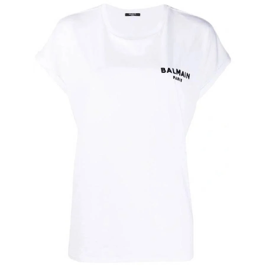 Balmain Ladies Tops. Fashion category: T-Shirts & Henleys. SKU: UF11351I382-GAB. Color: White/Black. Balmain Logo Print Cotton T Shirt. This shirt features a crewneck, a contrasting logo print on the chest, a ribbed neckline, and folded sleeves. 100% Cotton. GENERAL Brand Type: Designer Color: Blanc/Noir INFORMATION Brand: Balmain Gender: Womens Model: UF11351I382-GAB DETAILS Category: Tops Apparel Type: T-Shirts & Henleys Material: Cotton ADDITIONAL INFO Jomashop Sku: -UF11351I382GAB Department: Clothing