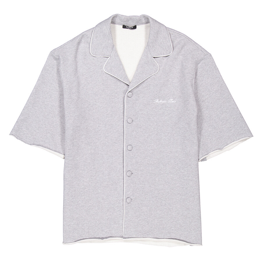 Balmain Men's Tops. Fashion category: Casual Button-Downs. SKU: CH0HN088JI09-GRIS CHINE CLAIR. Color: Grey. Balmain Men's Grey Cotton Shirt With Embroidered Logo. This cotton shirt features a jersey texture, contrasting borders, an embroidered logo on the chest, a buttonhole on the front, short sleeves, and a straight hem. 100% cotton. GENERAL Color: Grey INFORMATION Brand: Balmain Gender: Mens Model: CH0HN088JI09-GRIS CHINE CLAIR DETAILS Category: Tops Apparel Type: Casual Button-Downs Material: Cotton ADDITIONAL INFO Jomashop Sku: -8JI09GRISCHINECLAIR Department: Clothing