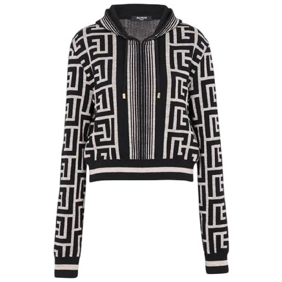 Balmain Ladies Tops. Fashion category: Hoodies & Sweatshirts. SKU: XF1JP005KB34-GFE. Color: Gfe Ivoire/Black. Balmain Monogram Drawstring hoodie. This hoodie features an adjustable drawstring, ribbed cuffs, a bottom hem, an iconic pattern, and a cropped fit. 50% Cotton, 50% Acrylic. Made in France. GENERAL Brand Type: Designer Color: Gfe Ivoire/Noir INFORMATION Brand: Balmain Gender: Womens Model: XF1JP005KB34-GFE DETAILS Category: Tops Apparel Type: Hoodies & Sweatshirts Material: Cotton ADDITIONAL INFO Jomashop Sku: -XF1JP005KB34GFE Department: Clothing