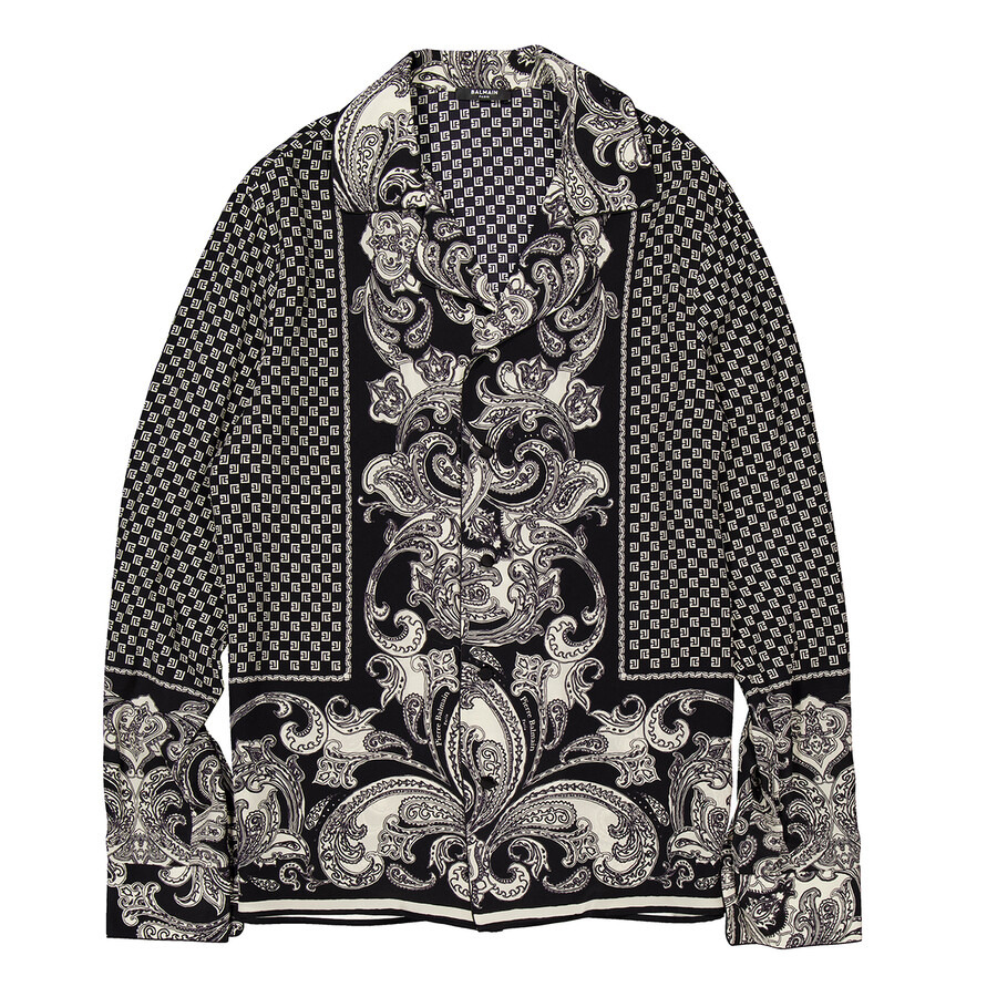 Balmain Men's Tops. Fashion category: Casual Button-Downs. SKU: CH1HU236SD29-EDK NOIR/IVOIRE. Color: Black. Balmain Monogram-Print Silk Shirt. This silk shirt features fabric-covered buttons, a camp collar, and a front button fastening. It has long sleeves with buttoned cuffs and a straight hem. The shirt is adorned with an allover monogram and paisley print for a distinctive look. Silk 100% Made in Italy. GENERAL Color: Black INFORMATION Brand: Balmain Gender: Mens Model: CH1HU236SD29-EDK NOIR/IVOIRE DETAILS Category: Tops Apparel Type: Casual Button-Downs Material: Silk ADDITIONAL INFO Jomashop Sku: -36SD29EDKNOIRIVOIRE Department: Clothing