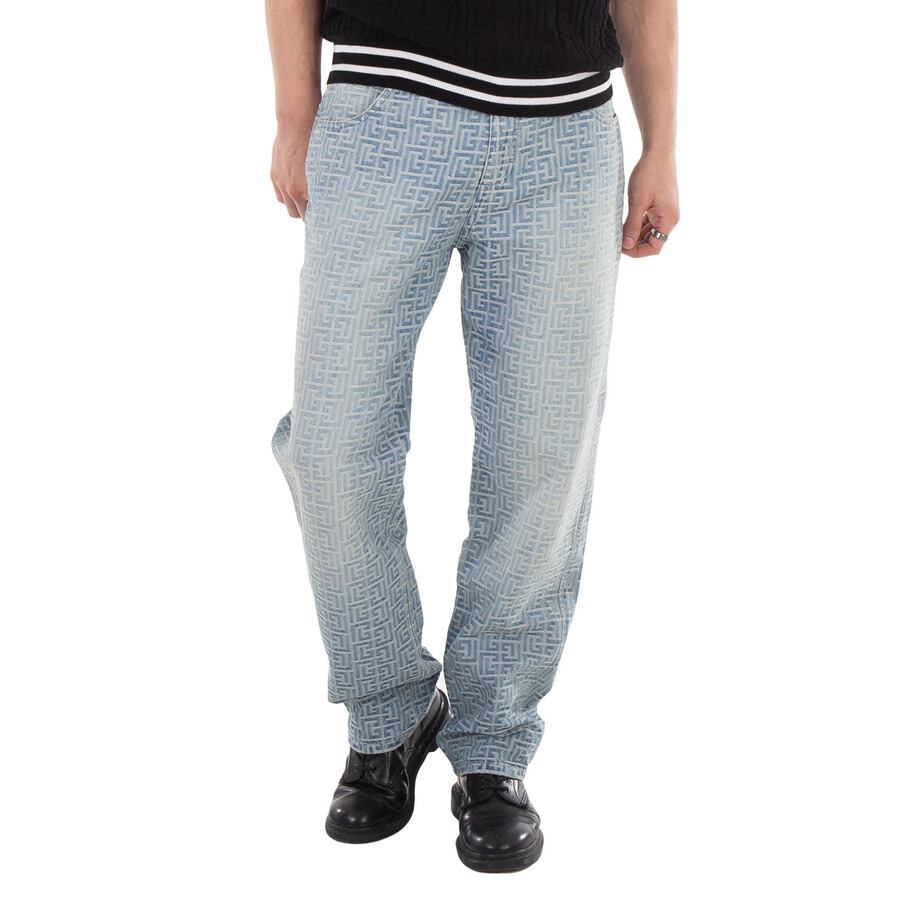 Balmain Men's Bottoms. Fashion category: Jeans & Denim. SKU: CH1MI040DD27-6FF BLEU JEAN. Color: Blue. Balmain Monogrammed Jacquard Denim Jeans. This pair of denim jeans features a straight cut with five classic pockets, including two side pockets, one coin pocket, and two patch pockets at the back. They are fastened with a silver metal tack button and a zip at the front, and feature triple belt loops. The jeans are completed with an allover monogrammed jacquard pattern. 100% cotton. Made in Italy. GENERAL Color: Blue INFORMATION Brand: Balmain Gender: Mens Model: CH1MI040DD27-6FF BLEU JEAN DETAILS Category: Bottoms Apparel Type: Jeans & Denim Material: Cotton ADDITIONAL INFO Jomashop Sku: -I040DD276FFBLEUJEAN Department: Clothing