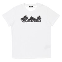 Balmain Men's Tops. Fashion category: T-Shirts & Henleys. SKU: DH1EF000GD85-BLANC/NOIR. Color: Blanc/Noir. Balmain Palm-Print Cotton T-Shirt. A cotton jersey-textured t-shirt featuring a crew neck, short sleeves, straight hem, and a relaxed fit. It is finished with a logo print and a palm tree graphic on the front. Cotton 100% Made in Portugal. GENERAL Brand Type: Designer Color: Blanc/Noir INFORMATION Brand: Balmain Gender: Mens Model: DH1EF000GD85-BLANC/NOIR DETAILS Category: Tops Apparel Type: T-Shirts & Henleys Material: Cotton ADDITIONAL INFO Jomashop Sku: -1EF000GD85BLANCNOIR Department: Clothing