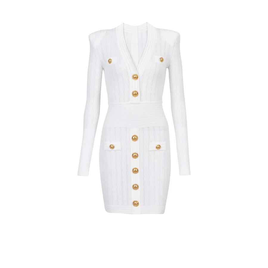 Balmain Ladies Dresses. SKU: YF1R8060KB00-0FA. Color: White. Balmain Short Eco-Designed Knit Dress with Gold-Tone Buttons. This short knit dress combines sustainability with Balmain’s signature elegance. Crafted from eco-designed viscose sourced from sustainably managed forests and blended with polyester, it features a fitted silhouette, long sleeves, and openwork detailing. Embossed gold-tone buttons accent the front, while a back zip ensures a sleek finish. Material: 83% viscose from sustainably managed forests, 17% polyester. GENERAL Brand Type: Designer Color: White INFORMATION Brand: Balmain Gender: Womens Model: YF1R8060KB00-0FA DETAILS Category: Dresses ADDITIONAL INFO Jomashop Sku: -YF1R8060KB000FA Department: Clothing