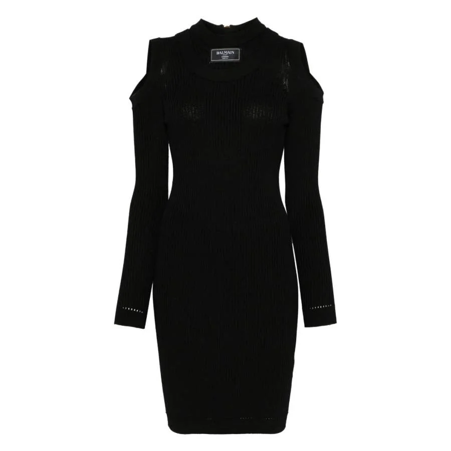 Balmain Ladies Dresses. Fashion category: Casual Dresses. SKU: EF1R8291KI10-NOIR. Color: Noir. Balmain Siganture Logo Patch Knit Mini Dress. This dress features a sleek rear zip fastening, complemented by intricate cut-out detailing and ribbed accents that add texture and depth, while layered details create a dynamic, structured silhouette, merging contemporary design with elevated sophistication. 84% Viscose, 16% Polyester. Made in Italy. GENERAL Brand Type: Designer Color: Noir INFORMATION Brand: Balmain Gender: Womens Model: EF1R8291KI10-NOIR DETAILS Category: Dresses Apparel Type: Casual Dresses Material: Polyester, Viscose ADDITIONAL INFO Jomashop Sku: -EF1R8291KI10NOIR Department: Clothing