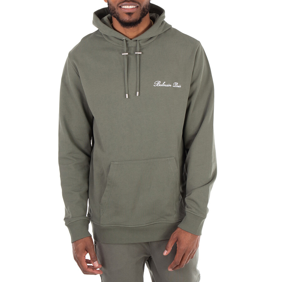 Brand: Balmain. Fashion category: Hoodies & Sweatshirts. SKU: DH1JT047BC78-KAKI CLAIR/BLANC. Color: Kaki Clair/Blanc. Balmain Signature Cotton Hoodie. A cotton hoodie featuring a relaxed fit, round neck, and a drawstring-adjustable hood. It has long sleeves, a contrasting Balmain Signature embroidery on the front, a kangaroo pocket, and engraved silver aglets, eyelets, and stoppers. The hoodie is finished with ribbed edging. 100% cotton. Made in Portugal. GENERAL Brand Type: Designer Color: Kaki Clair/Blanc INFORMATION Brand: Balmain Gender: Mens Model: DH1JT047BC78-KAKI CLAIR/BLANC DETAILS Category: Tops Apparel Type: Hoodies & Sweatshirts Material: Cotton ADDITIONAL INFO Jomashop Sku: -7BC78KAKICLAIRBLANC Department: Clothing