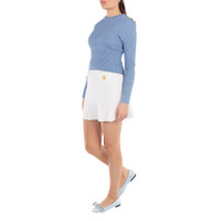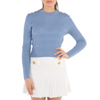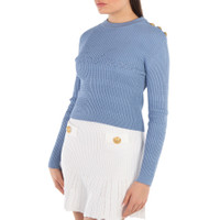 Balmain Ladies Tops. Fashion category: Cardigans & Sweaters. SKU: CF1KA003KF24-BLEU PALE. Color: Blue. Balmain Signature Knit Jumper. This fine-knit jumper features a tight fit, round neck, and long sleeves with ribbed edging. It is adorned with six decorative golden metal "Signature Lion" buttons and finished with a signature trompe-l'œil logo. 84% viscose 16% polyester. Made in Italy. GENERAL Color: Blue INFORMATION Brand: Balmain Gender: Womens Model: CF1KA003KF24-BLEU PALE DETAILS Category: Tops Apparel Type: Cardigans & Sweaters Material: Polyester, Viscose ADDITIONAL INFO Jomashop Sku: -F1KA003KF24BLEUPALE Department: Clothing