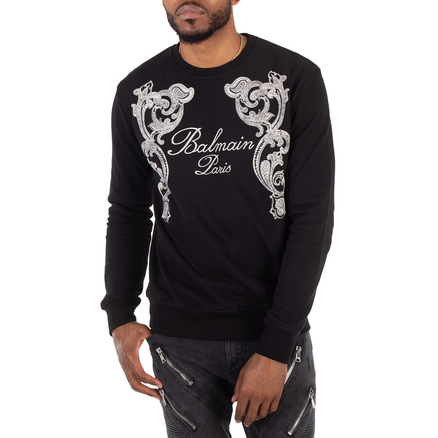 Brand: Balmain. Fashion category: Hoodies & Sweatshirts. SKU: CH1JQ040GD30-EDK NOIR/IVOIRE. Color: Black. Balmain Signature Paisley Print Sweatshirt. Crafted from soft cotton fleece, this sweatshirt features a crewneck, long sleeves, and ribbed trims. It offers a relaxed fit and is finished with the label's logo in a paisley-style print across the chest. 100% Cotton. GENERAL Color: Black INFORMATION Brand: Balmain Gender: Mens Model: CH1JQ040GD30-EDK NOIR/IVOIRE DETAILS Category: Tops Apparel Type: Hoodies & Sweatshirts Material: Cotton ADDITIONAL INFO Jomashop Sku: -40GD30EDKNOIRIVOIRE Department: Clothing