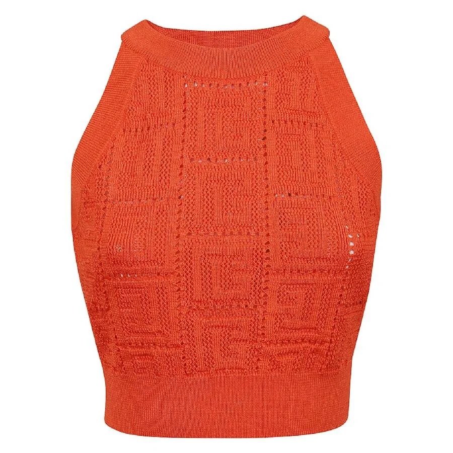 Balmain Ladies Tops. Fashion category: T-Shirts & Henleys. SKU: XF1AB022KB16-2AF. Color: Orange Fonce. Balmain Sleeveless Monogram Mesh Top. This top features a sleeveless design, a cropped fit, and is decorated with the Balmain monogram. 83% Viscose, 17% Polyamide. Made in Italy. GENERAL Brand Type: Designer Color: 2Af Orange Fonce INFORMATION Brand: Balmain Gender: Womens Model: XF1AB022KB16-2AF DETAILS Category: Tops Apparel Type: T-Shirts & Henleys Material: Polyamide, Viscose ADDITIONAL INFO Jomashop Sku: -XF1AB022KB162AF Department: Clothing