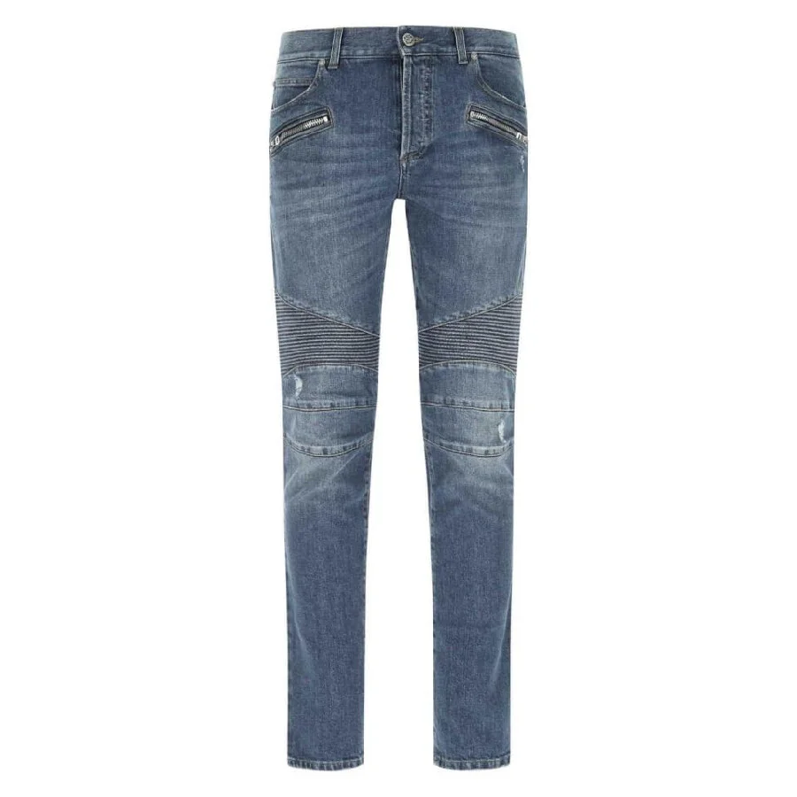 Balmain Men's Bottoms. Fashion category: Jeans & Denim. SKU: XH1MH005DB68-6FF. Color: Ff Bleu Jean. Balmain Slim Cut Denim Jeans. This pant features a semi-washed effect, ribbed knee inserts, slight rips, a black brand label on the back, two front side zip pockets, two front pockets, two back pockets, a button closure, and belt loops. 98% Cotton, 2% Elastane. Made in Italy. GENERAL Brand Type: Designer Color: Ff Bleu Jean INFORMATION Brand: Balmain Gender: Mens Model: XH1MH005DB68-6FF DETAILS Category: Bottoms Apparel Type: Jeans & Denim Material: Cotton ADDITIONAL INFO Jomashop Sku: -XH1MH005DB686FF Department: Clothing