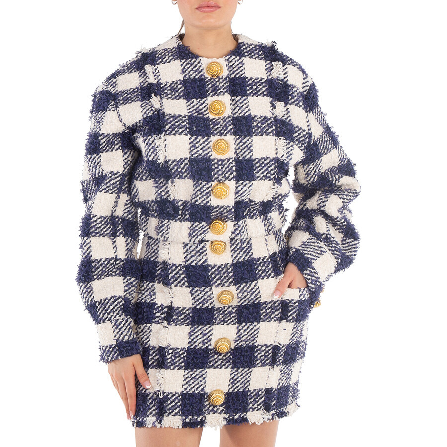 Balmain Ladies Outerwear. Fashion category: Coats & Jackets. SKU: DF0TF285CF59-MARINE/BLANC. Color: Marine/Blanc. Balmain Tweed Crop Bomber Jacket. This metallic tweed bomber jacket features eyelash-fringed edges and a round neckline with a single-breasted front. It has long sleeves, a regular fit, and banded cuffs and hem for a structured yet stylish look. GENERAL Color: Marine/Blanc INFORMATION Brand: Balmain Gender: Womens Model: DF0TF285CF59-MARINE/BLANC DETAILS Category: Outerwear Apparel Type: Coats & Jackets ADDITIONAL INFO Jomashop Sku: -F285CF59MARINEBLANC Department: Clothing