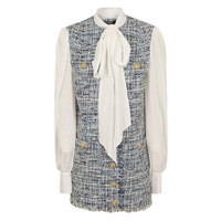 Balmain Ladies Dresses. SKU: EF1R9266MG25. Color: Bleu Jean Clair/Blanc. Balmain Tweed Pussy Bowl Mini Dress. This tweed mini dress offers a refined yet playful silhouette, showcasing classic tailoring with feminine details. It features a front button fastening and a chic pussy-bow tie at the neckline, complemented by long sleeves with buttoned cuffs. Four front patch pockets add a structured, vintage-inspired touch, making this piece both stylish and versatile for polished day-to-night dressing. Outer: Silk 100%, Cotton 78%, Acrylic 10%, Viscose 8%, Polyamide 3%, Polyester 1%. Lining: Viscose 52%, Cotton 48%. GENERAL Brand Type: Designer Color: Bleu Jean Clair/Blanc INFORMATION Brand: Balmain Gender: Womens Model: EF1R9266MG25-BLEU JEAN CLAIR/BLANC DETAILS Category: Dresses Apparel Type: Casual Dresses ADDITIONAL INFO Jomashop Sku: -5BLEUJEANCLAIRBLANC Department: Clothing